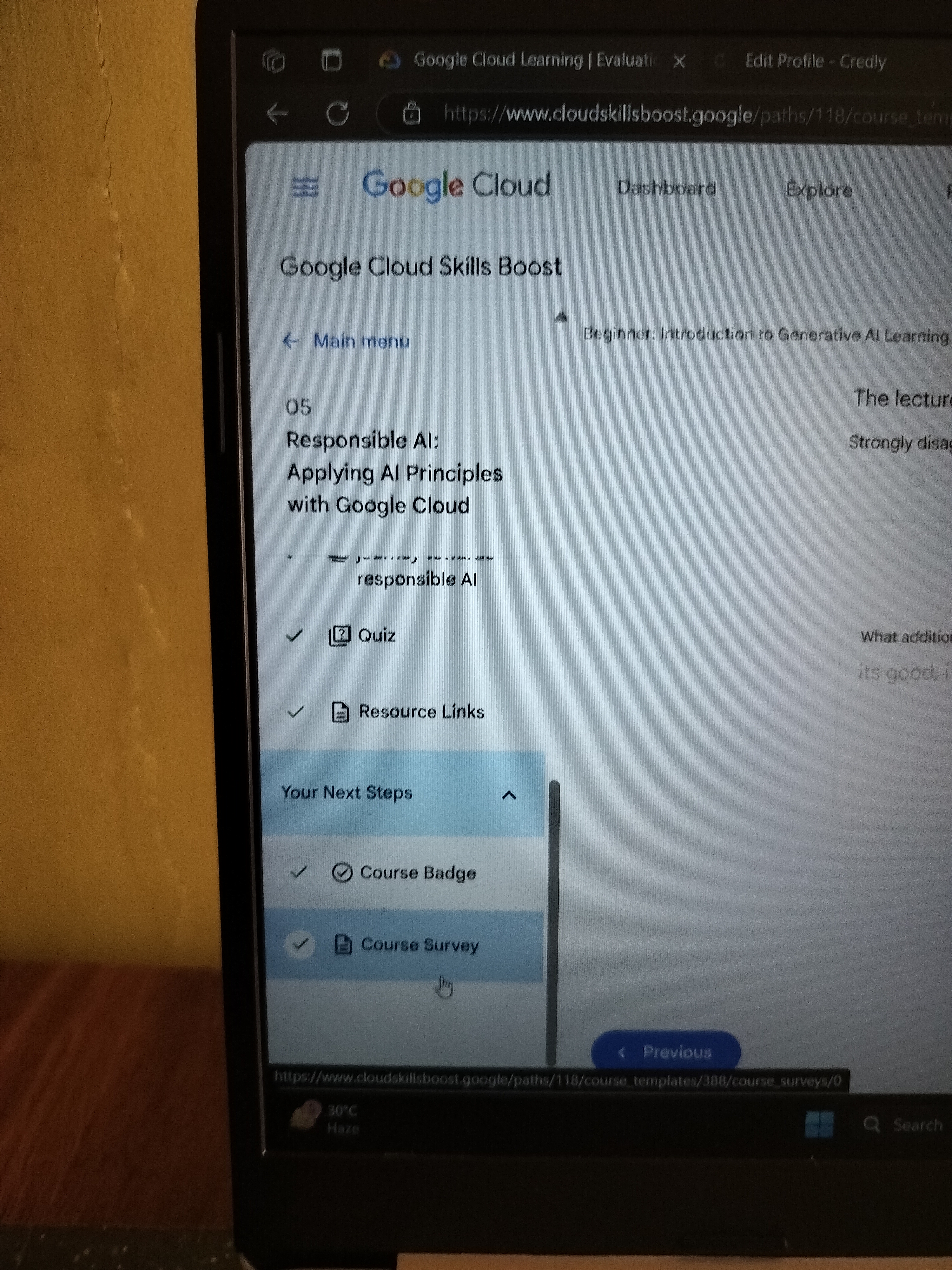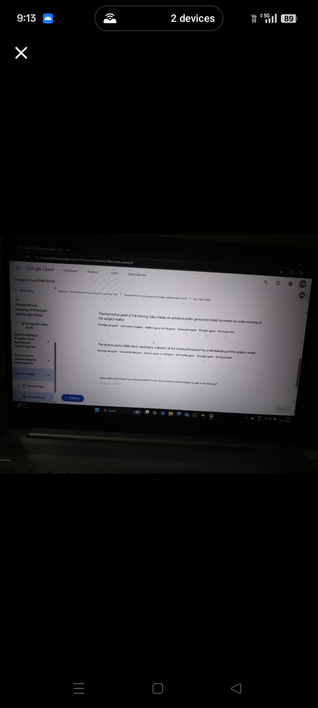 Please Help Me Out 😭 I’m stuck on the last part of the Google Cloud course survey. The ‘Next’ button won’t activate even after I answered everything. Can you please check if I missed anything, especially in the lecture-related question? I’ve selec