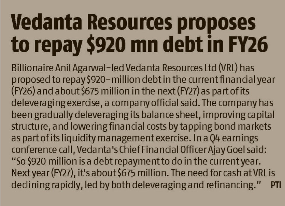 "Vedanta Hits the Debt Gym: $920M Repayment Workout in FY26!" Vedantaโs debt plan feels like a financial detoxโ$920 million this year, $675 million nextโlike itโs hitting the fiscal gym hard! With Anil Agarwal at the helm and CFO Ajay Goel cheering