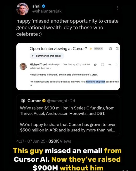 Missed email cost millions 📧 Imagine skipping an email from a startup... And 6 months later, they raise $900 MILLION and hit $500M ARR 😮 That's exactly what happened here 👇 An invite to be a founding engineer at Cursor AI went unopened... and n