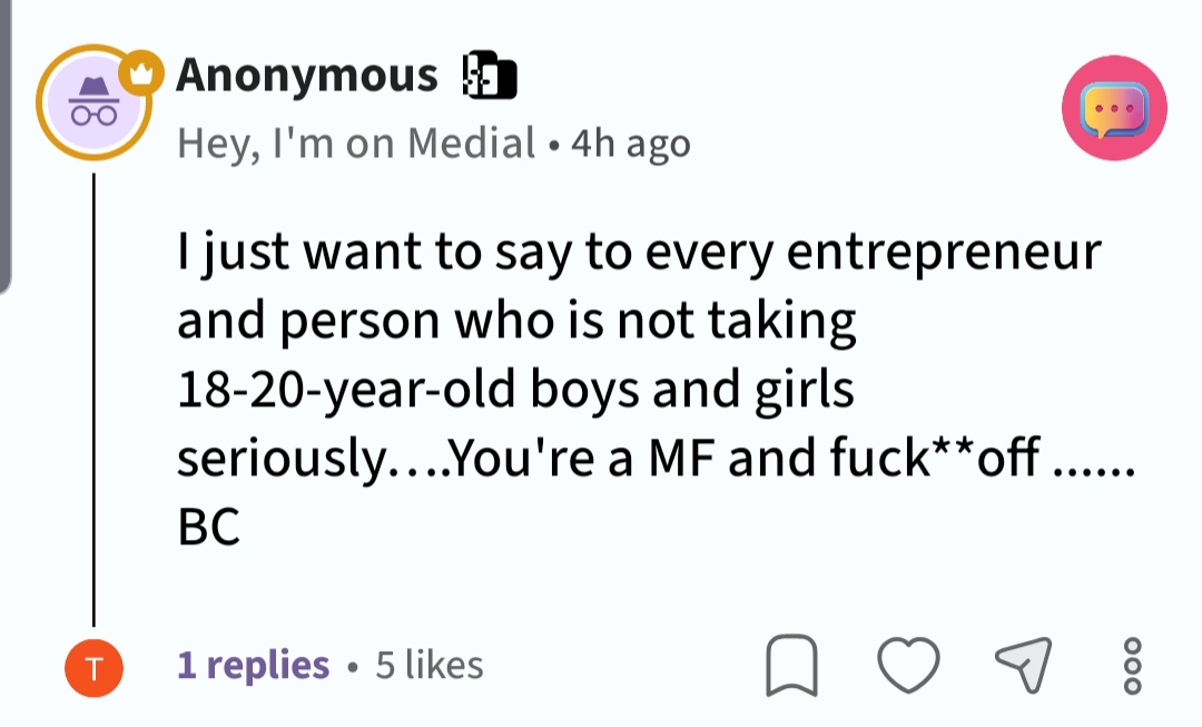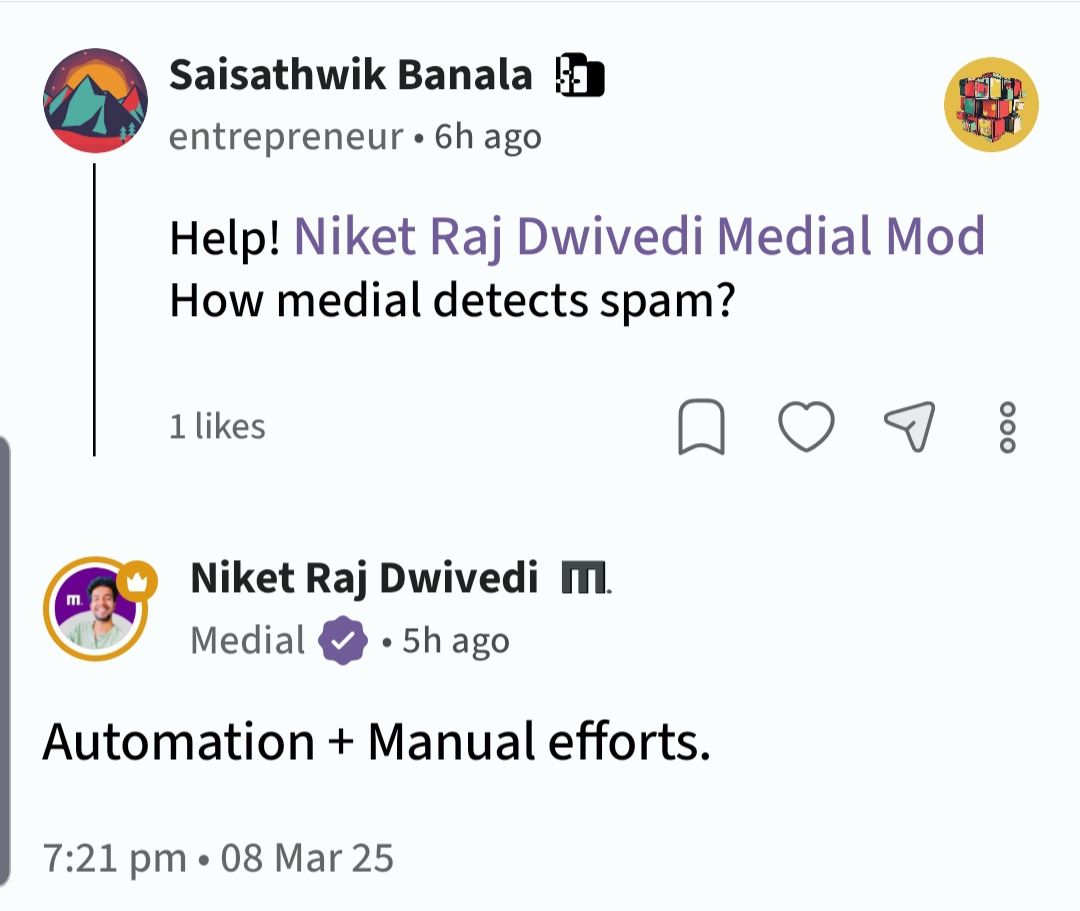 Question asked to Niket Raj Dwivedi by some user : How does Medial detects Spam Answer by Niket : Automation + manual please find the below pics .. either the automation is happy with Rash language and cuss words or the manual team was high on Satur