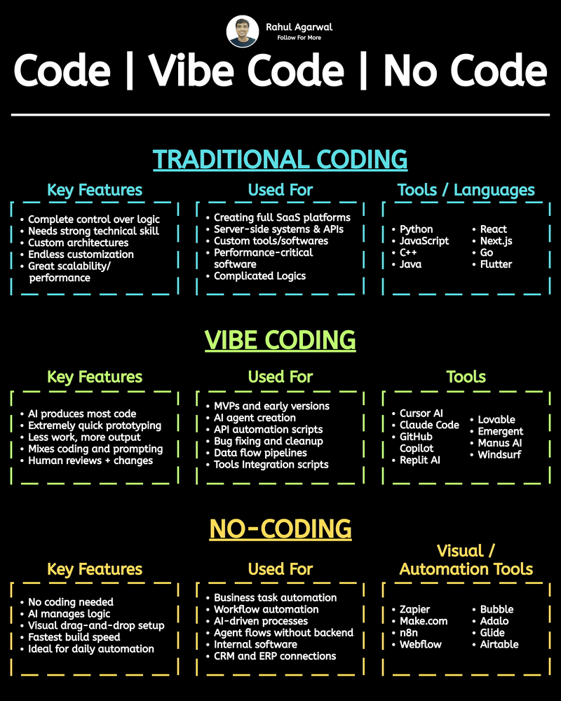 Most non-tech people learning coding get confused. I've explained it in a simple way below. 1. ๐ง๐ฟ๐ฎ๐ฑ๐ถ๐๐ถ๐ผ๐ป๐ฎ๐น ๐๐ผ๐ฑ๐ถ๐ป๐ด Writing every part of the system manually. Step-by-step: โข ๐ฅ๐ฒ๐พ๐๐ถ๐ฟ๐ฒ๐บ๐ฒ๐ป๐๐: You clearly define what the sof