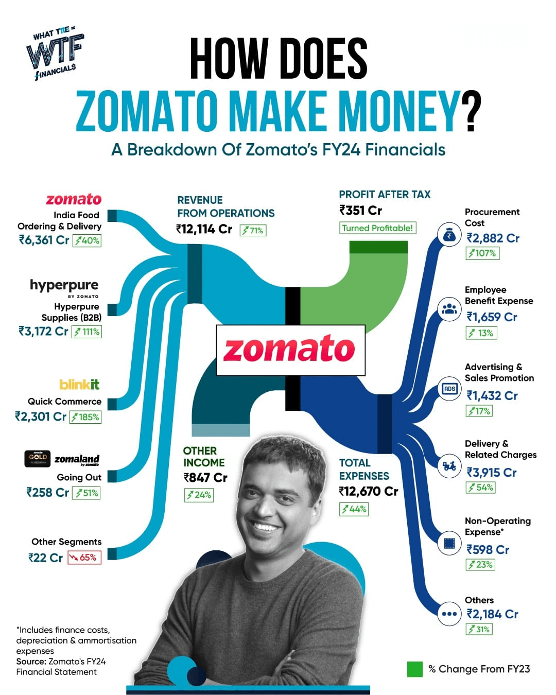 Zomato made โน12,114 crore in FY24, growing 71% mainly through food delivery, Hyperpure, and Blinkit. Despite expenses of โน12,670 crore, including procurement and delivery costs, Zomato turned profitable with โน351 crore profit after tax.