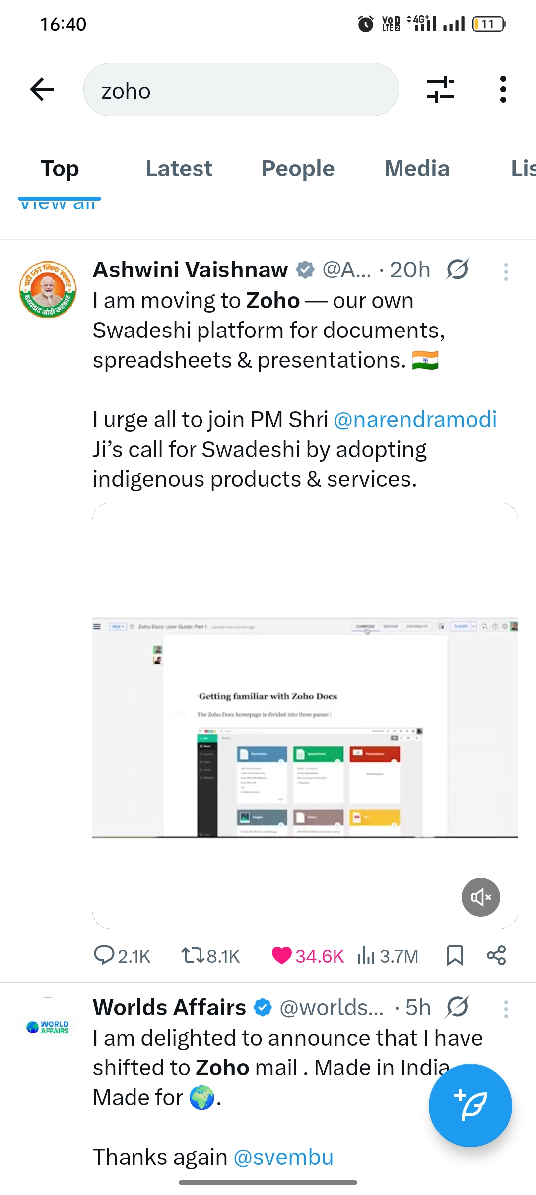 India's IT Minister Ashwini Vaishnaw: "I am moving to Zoho โ our own Swadeshi platform for documents, spreadsheets, and presentations. ๐ฎ๐ณ I urge everyone to join PM Shri Narendramodi Jiโs call for Swadeshi by adopting indigenous products and servi