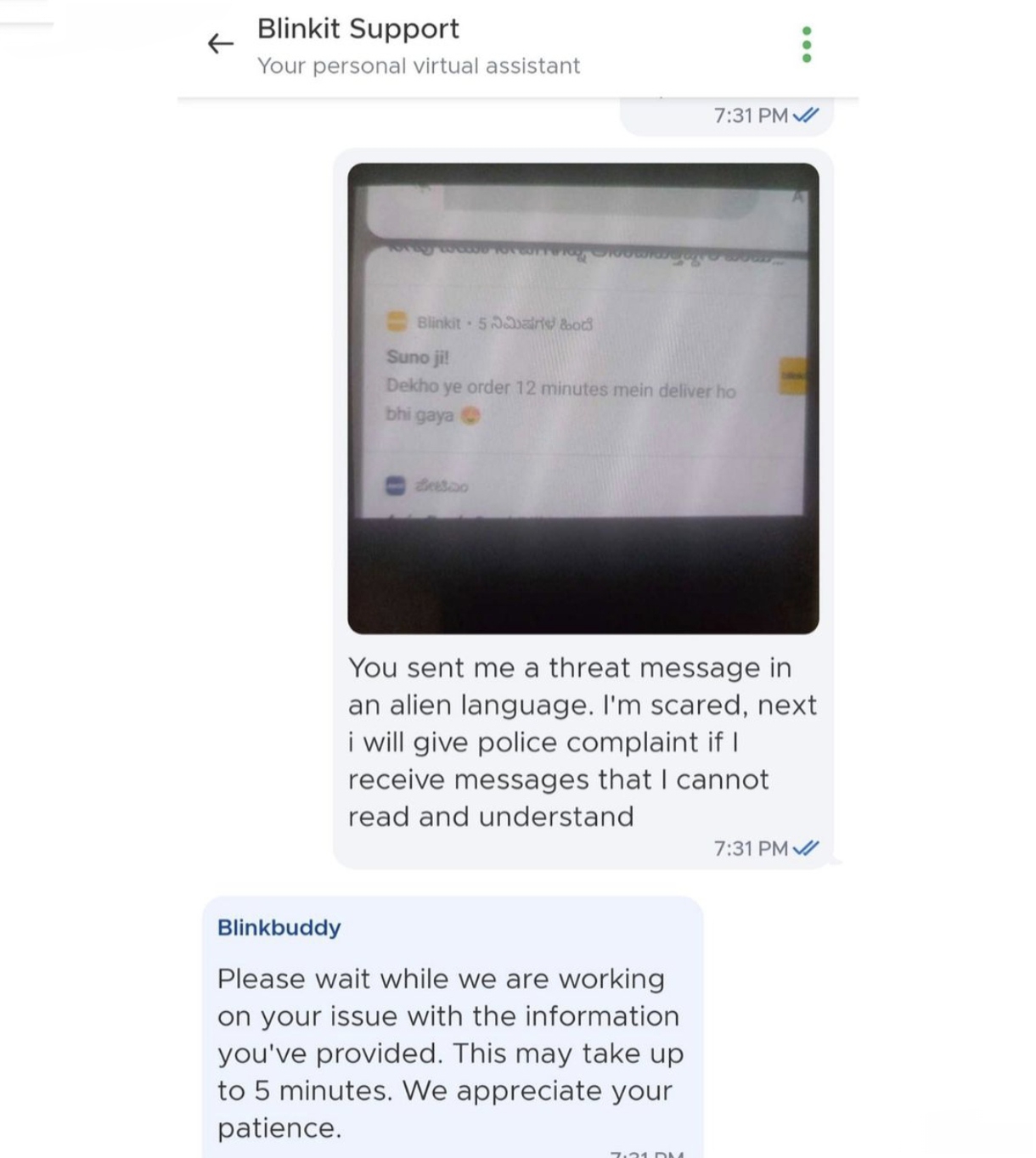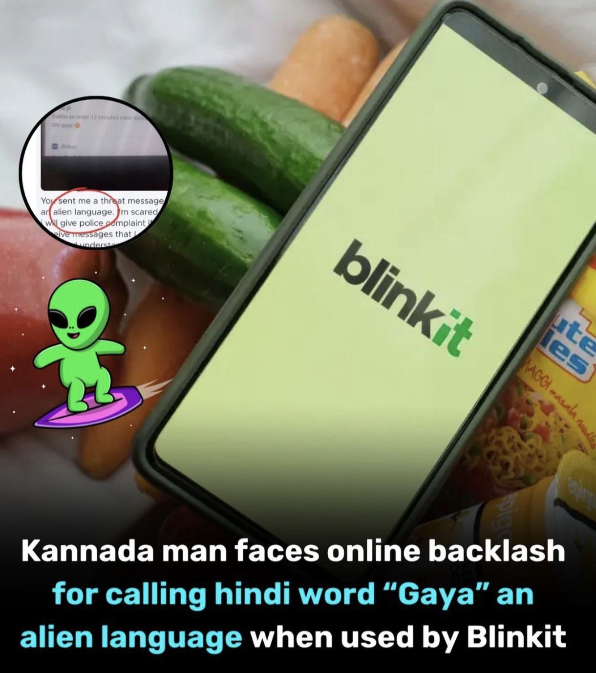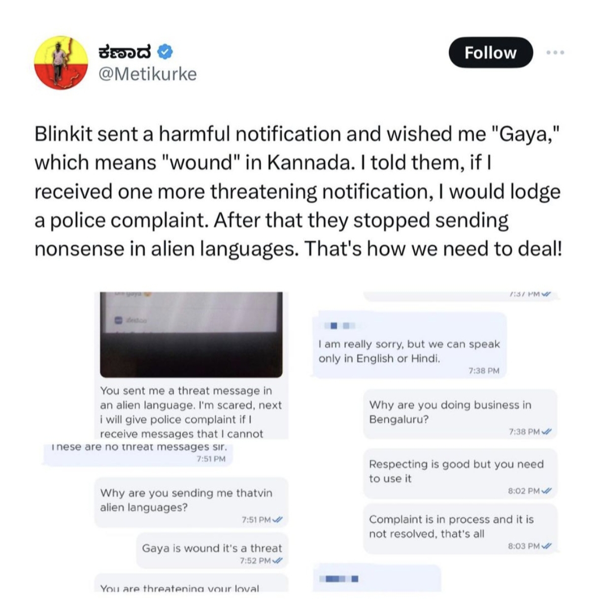 ๐ Now Blinkit is threating karnataka people's because blinkit sending โ Gaya โ word notification which means โ wound โ in kannada language so person filing police complaint against blinkit for sending threats . Notification - โ suno ji , dekho ye