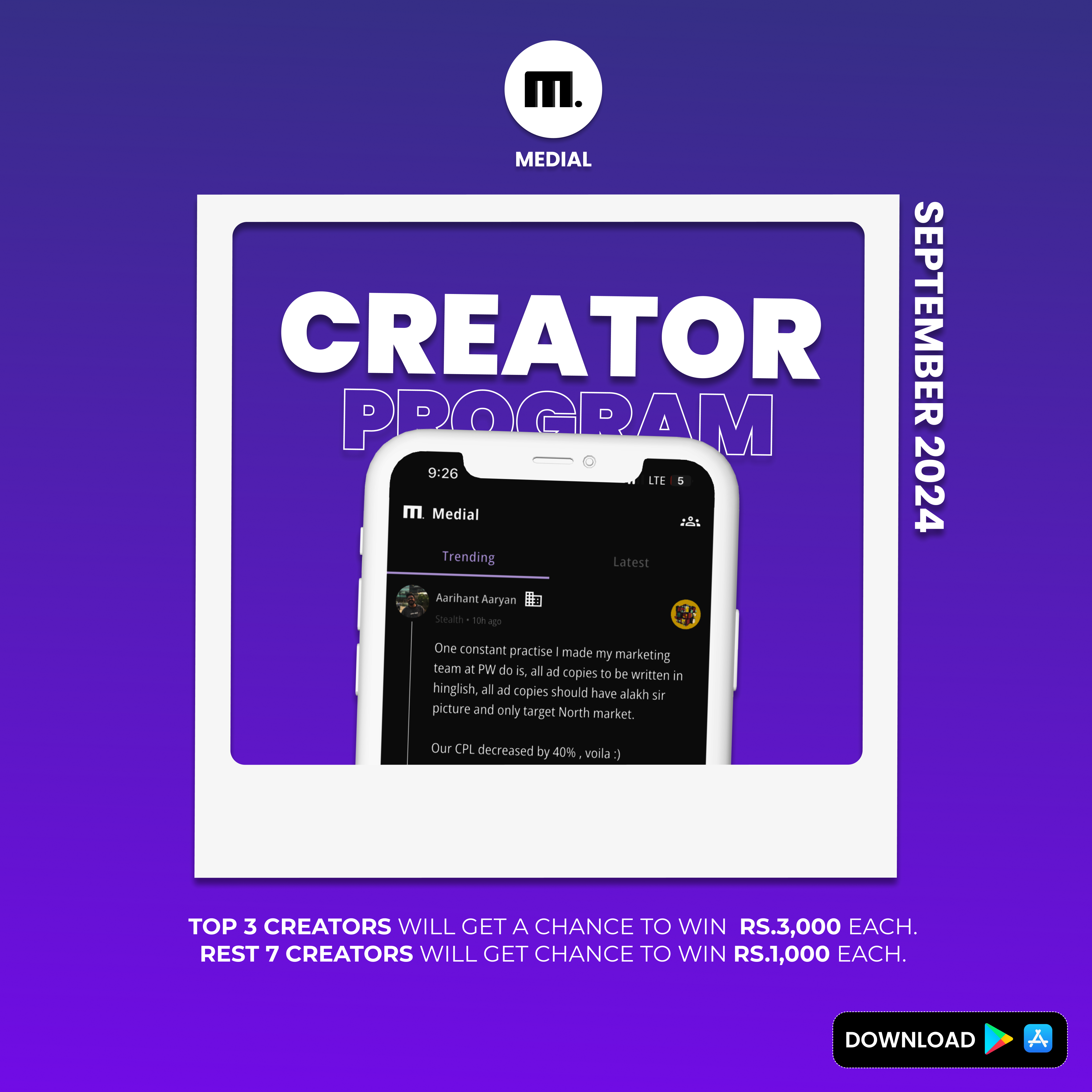 Announcement : Creators Program November 2024. Hello everyone! Weāre here to announce Medialās Creator Program for November. Top content creators will be decided on the basis of content they create and the comments they make to engage and help th