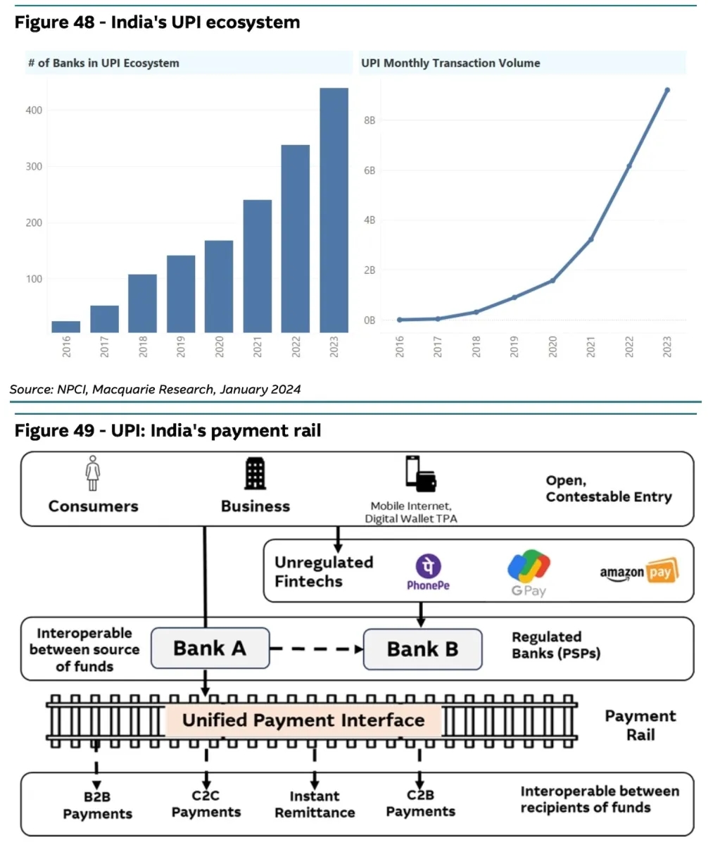As you see in the picture , UPI is skyrocketing since 2016 to 2024 to approx . 8B transactions . โข companies like Phonepe,Google pay are dominating the market with atleast 80% market share , Paytm market share fall from 13 to 9%. โข Government will