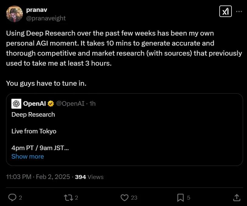 An OpenAI employee shared that using their internal "Deep Research" tool felt like their personal "AGI moment." They reported that it now takes just 10 minutes to generate accurate and comprehensive competitive and market research (with sources), a