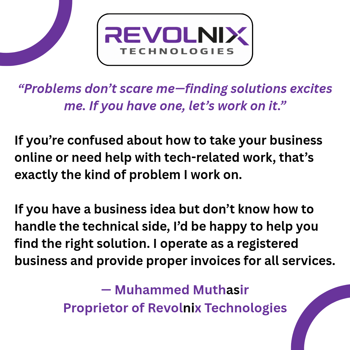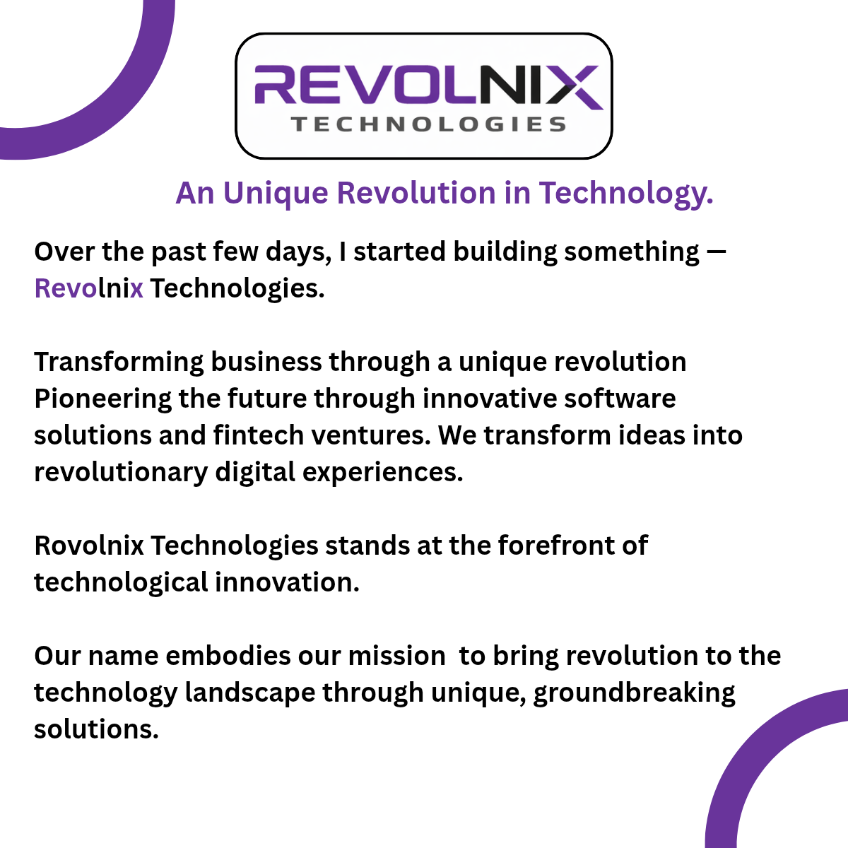 Revolnix Technologies is focused on delivering practical software solutions and helping businesses build a strong digital presence. We specialize in understanding real-world business problems and connecting them with the right technical expertise to