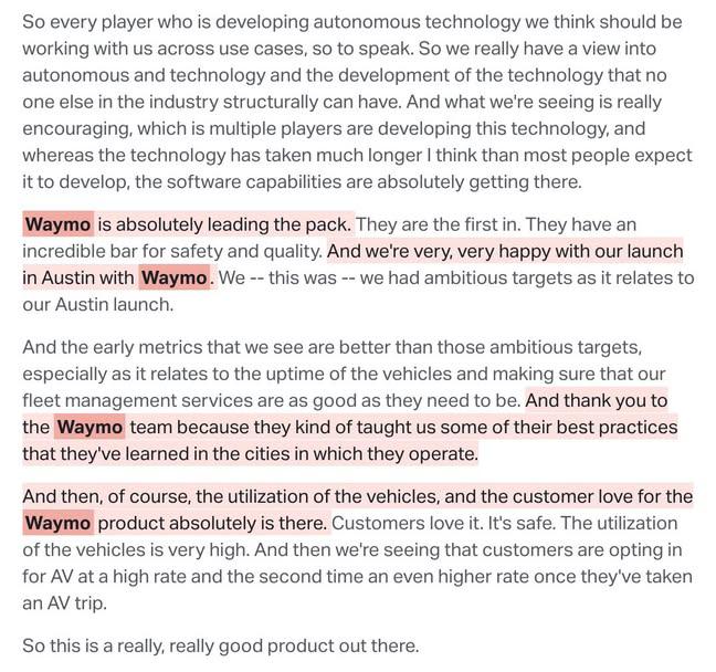 Uber CEO, Dara Khosrowshahi, says Alphabet's Waymo is "Absolutely leading the pack". "Customers love it. It's safe. The utilization of the vehicles is very high - we're seeing that customers are opting in - at a high rate and the second time an even