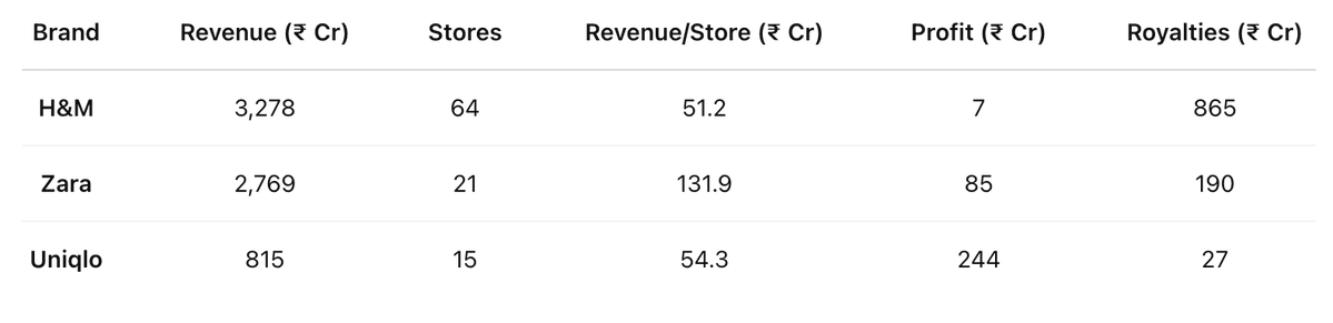 I assumed H&M’s lower price point would translate into healthier profits. H&M may lead in total sales, but it’s shelling out 4.5× what Zara pays in royalties — ₹865 Cr vs Zara’s ₹190 Cr, eating into margins⤵️ (source - Entrackr) From what I’ve seen