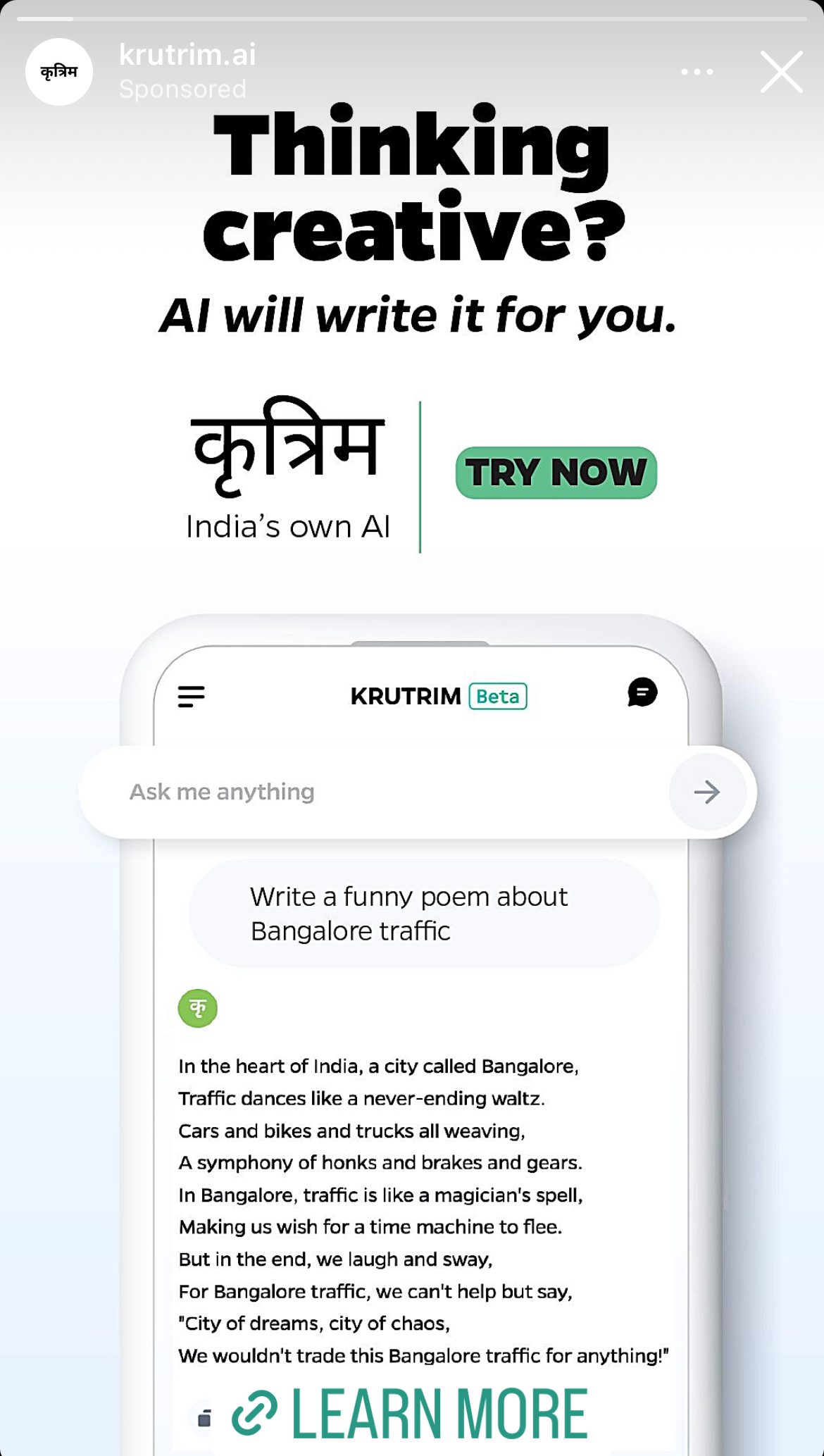 Krutrim is running ads on Instagram 😂😂 Can’t stop laughing since I saw this. Tells you a lot about low quality products/copycats. ChatGPT never advertised. Such natural user adoption. This is where the $50M is going.