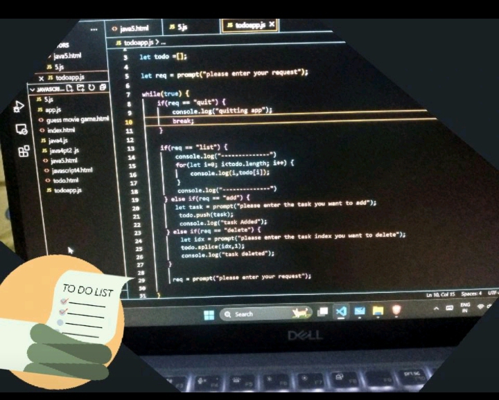 #day29 of #100DaysOfCode #100daysofcodechallenge Today I make TO-DO App using JavaScript. I use while and for loops also if and else if condition.. For adding and deleting from list I use prompt Command.... #Javascript #Connect #Connections #tech