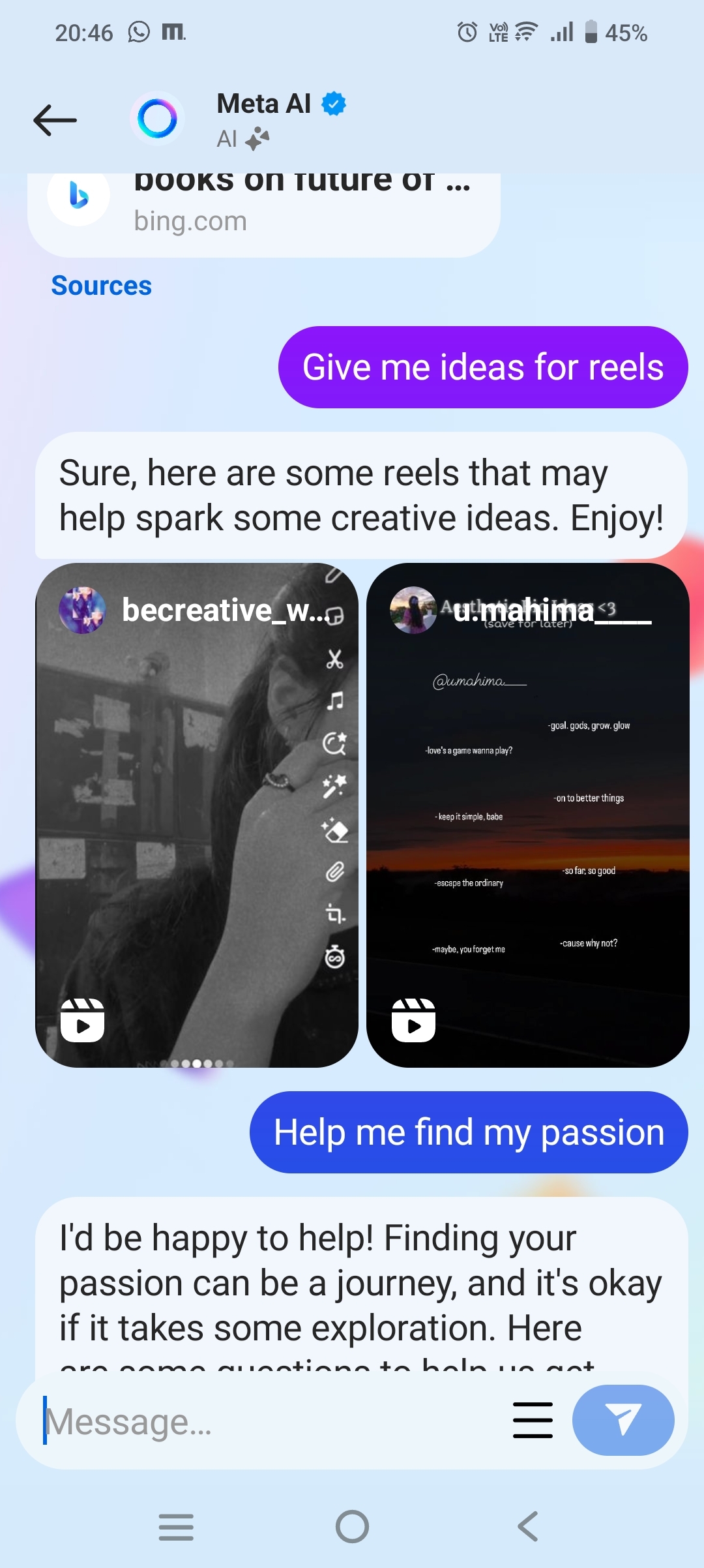 And I tried this prompt too.So meta ai works like a easy search bar which recommended top 2 reels so if influencers engages with 2 reels they may engage with other related posts like these in their reels section too.Hence it will help individuals,startups.. literally everyone whos engaged in social content creation! What do you think mate??I would like to know other people perspectives too