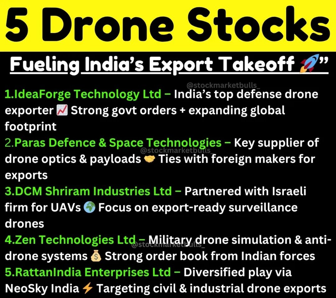 India’s Drone Revolution is Taking Off! These 5 powerful drone stocks are fueling India’s export growth and global dominance 🌍 💡 Top 5 Drone Stocks to Watch: 1️⃣ IdeaForge Technology Ltd – India’s leading defense drone exporter 📈 2️⃣ Paras Defen