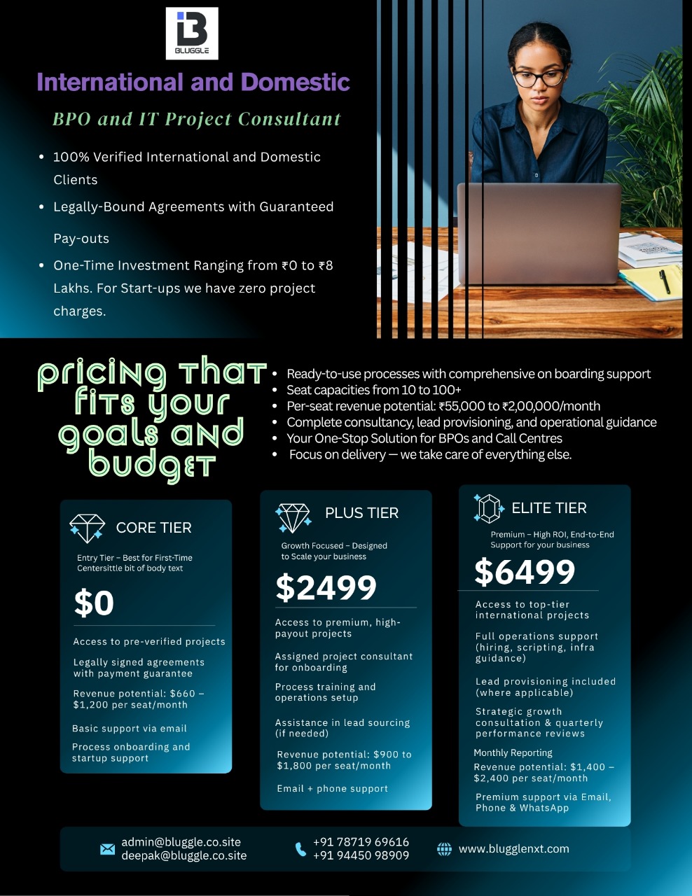 Whether you're launching a startup or running an established business, Bluggle provides intelligent BPO outsourcing services—combining voice and non-voice process expertise with dedicated support to streamline your operations and help you scale with
