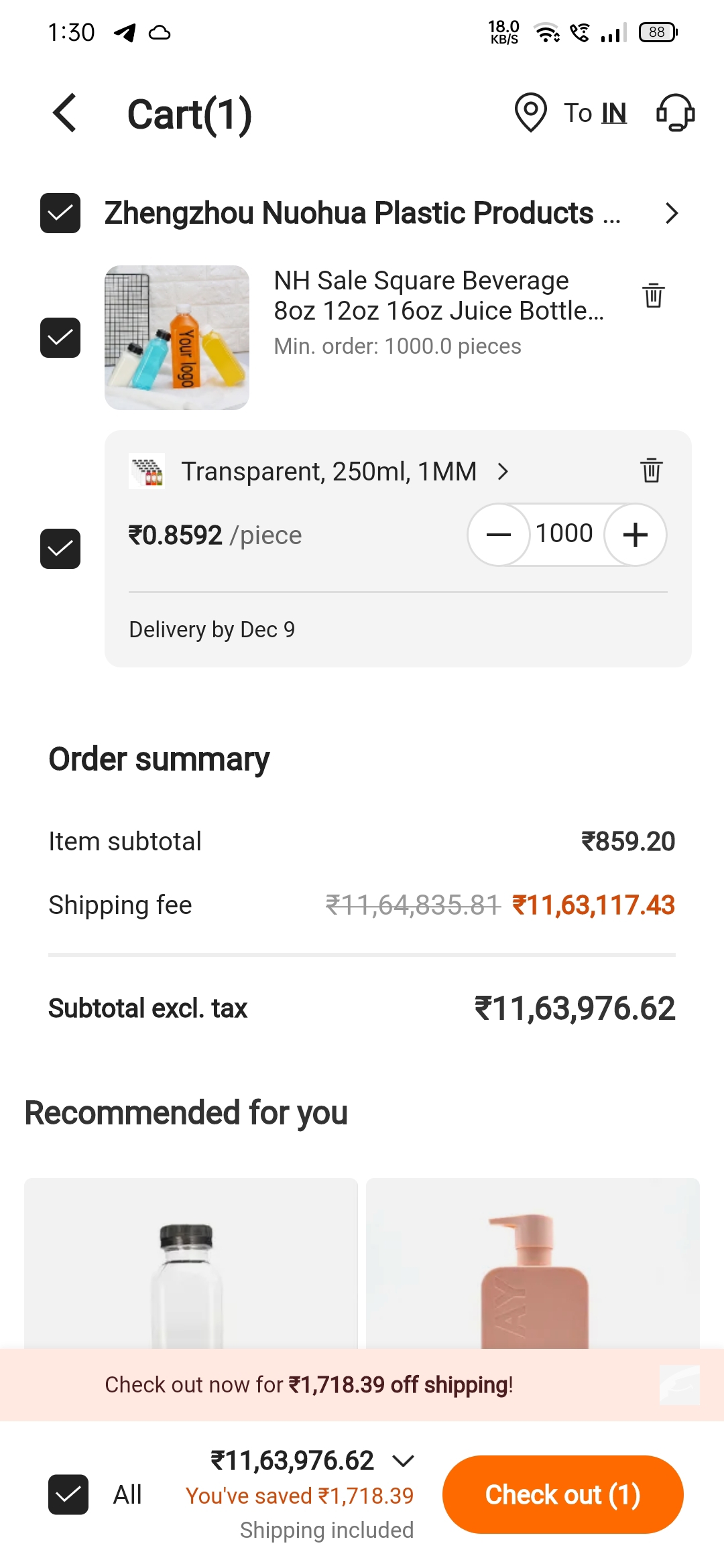 Broooo wtf is this....!! I am searching pet juice bottle for my product packaing and i found alibaba is offering at very nice price but but when i goes in the cart option to fullfill moq of 1000 pieces then what i got to know that i have to pay 1882