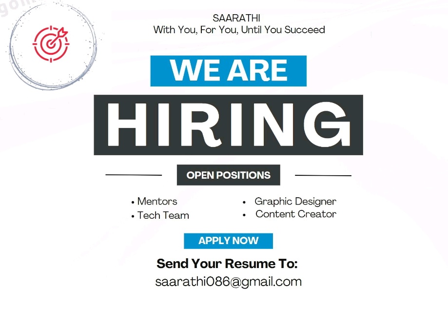 Saarathi is Hiring! | Join the Movement We're building a strong team to guide thousands of students across India and we need YOU! Are you passionate about mentoring, tech, design, or content? Saarathi is expanding its core team. Come, make a diffe