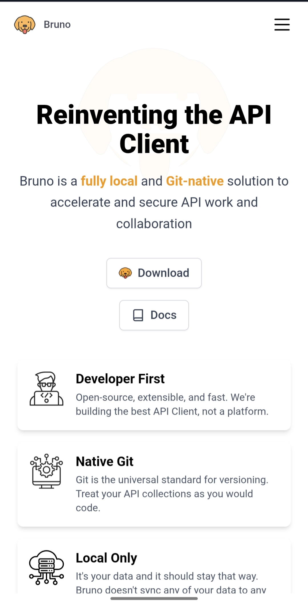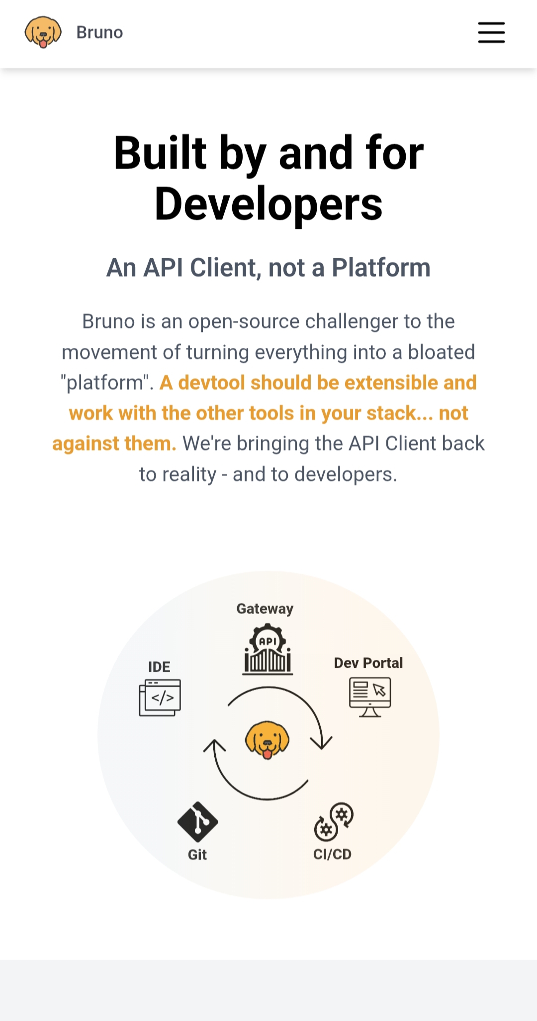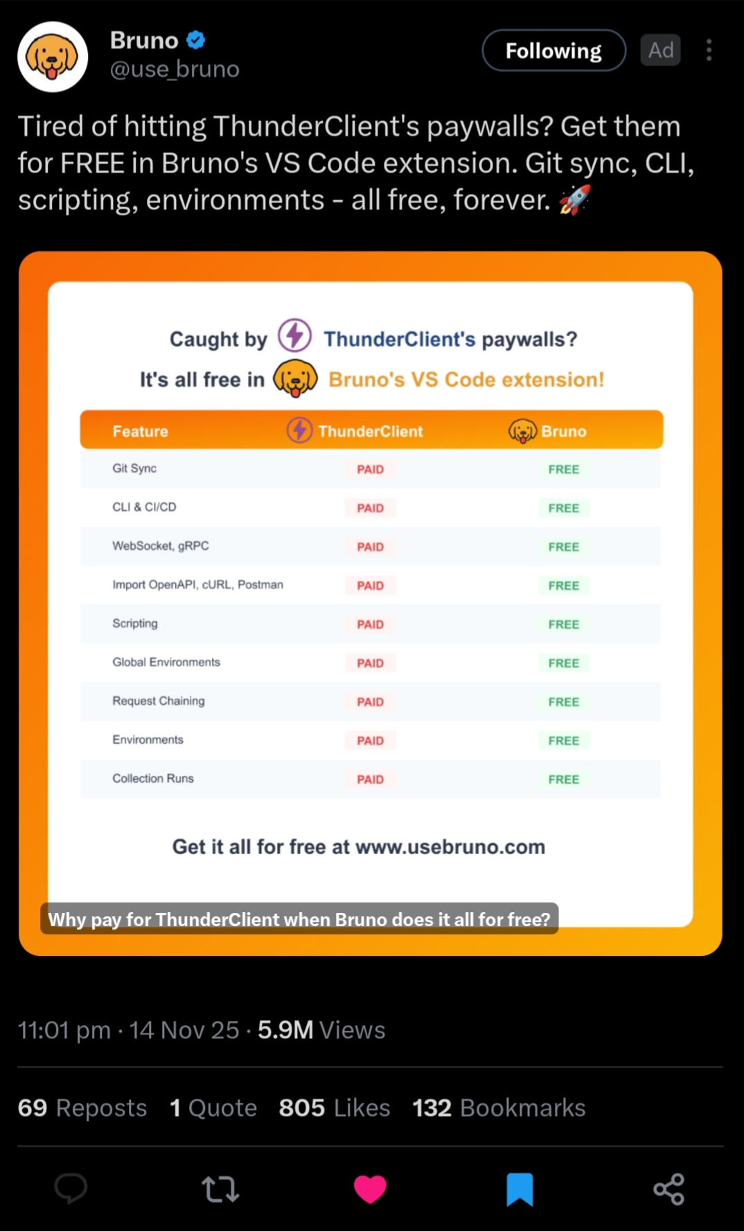Ditch Postman & Thunder Client. Meet Bruno. 🐕 https://www.usebruno.com It's 100% Open Source, Git-Native, and Offline-first. Your API collections live directly in your repo (.bru files), not on a paid cloud. Fast, privacy-focused, and completely fre