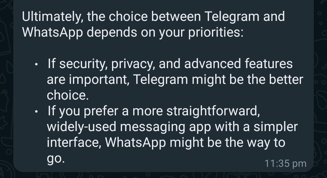 Mene avi "META AI" pe Telegram vs whatsApp send kiya or ye mereko ye vej raha he... Matlab apne hi muh se apni beizzati