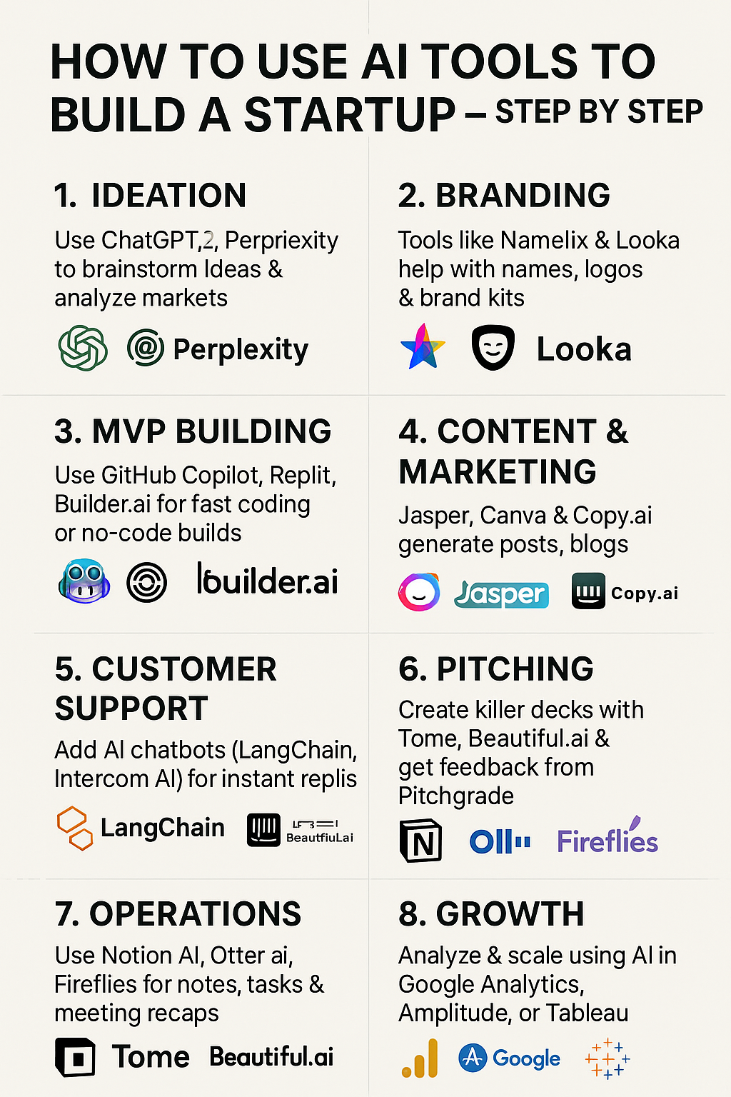 How to Use AI Tools to Build a Startup โ Step by Step: 1. Ideation: Use ChatGPT, Perplexity to brainstorm ideas & analyze markets. 2. Branding: Tools like Namelix & Looka help with names, logos & brand kits. 3. MVP Building: Use GitHub Copilot,