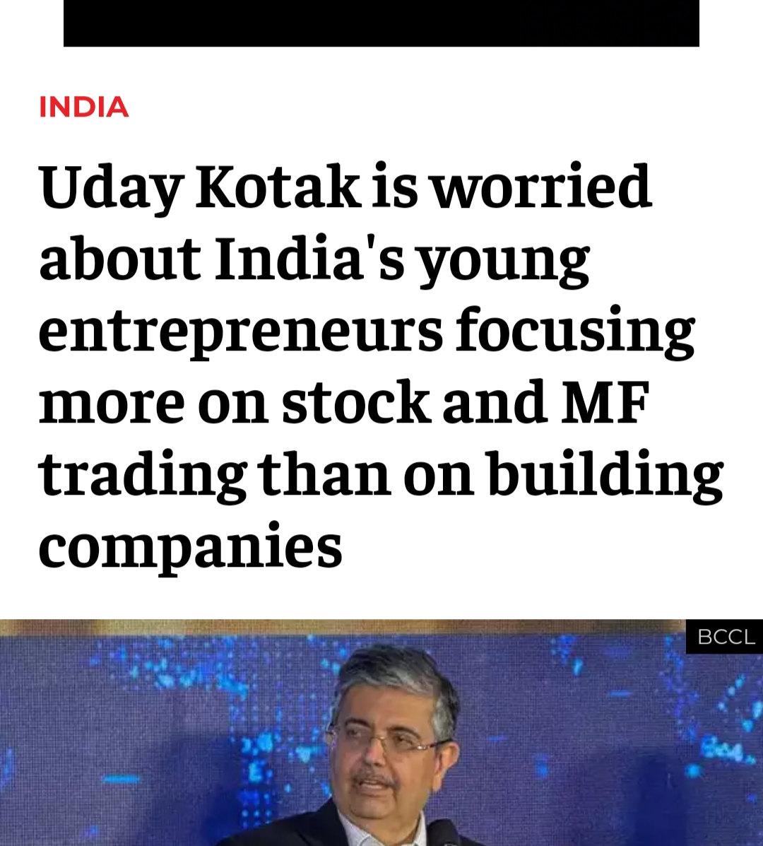 So Uday Kotak ( Chairman of Kotak Bank) is worried about India's young entrepreneurs focusing more on stock and MF trading than on building companies. ...โก๏ธ "What concerns me is that many in this generation are taking the easy way out, especially in