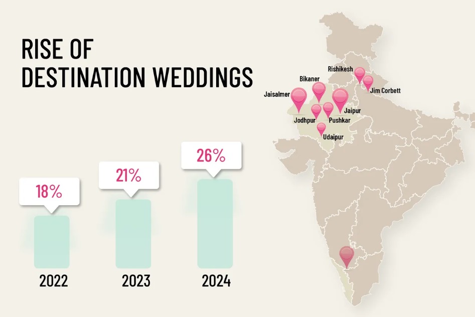 Destination weddings are on the rise in India ๐ฎ๐ณ From 18% in 2022 to 26% in 2024, couples are tying the knot in stunning locations like Jaipur, Udaipur, and Rishikesh. Which destination is on your wishlist? ๐โจ #DestinationWeddings #WeddingTren