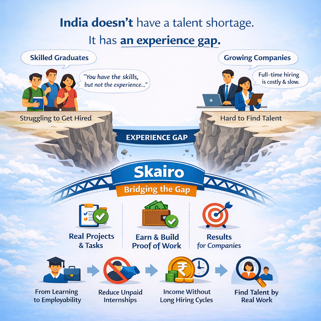 India doesnโt have a talent shortage. It has an experience gap. Students have skills but no proof. Companies need results, not resumes. Skairo bridges this gap with real tasks, real work, and real outcomes. Early access open : www.skairo.in #Futu