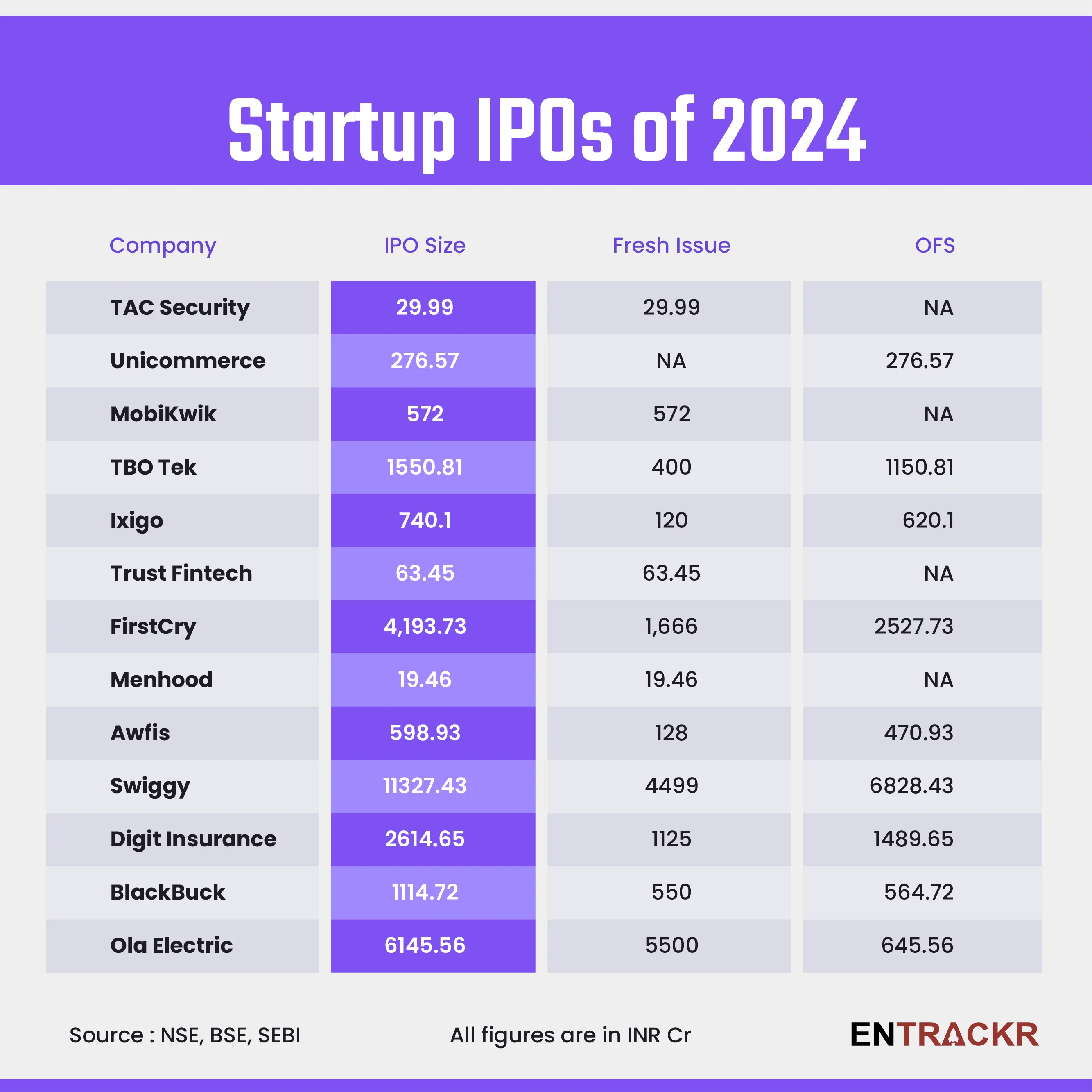 2024 IPO Highlights! 🚀 This year has seen 13 IPOs across a variety of sectors, including fintech, SaaS, logistics, proptech, electric vehicles, e-commerce, foodtech, and traveltech. In total, these companies successfully raised an impressive ₹29,24