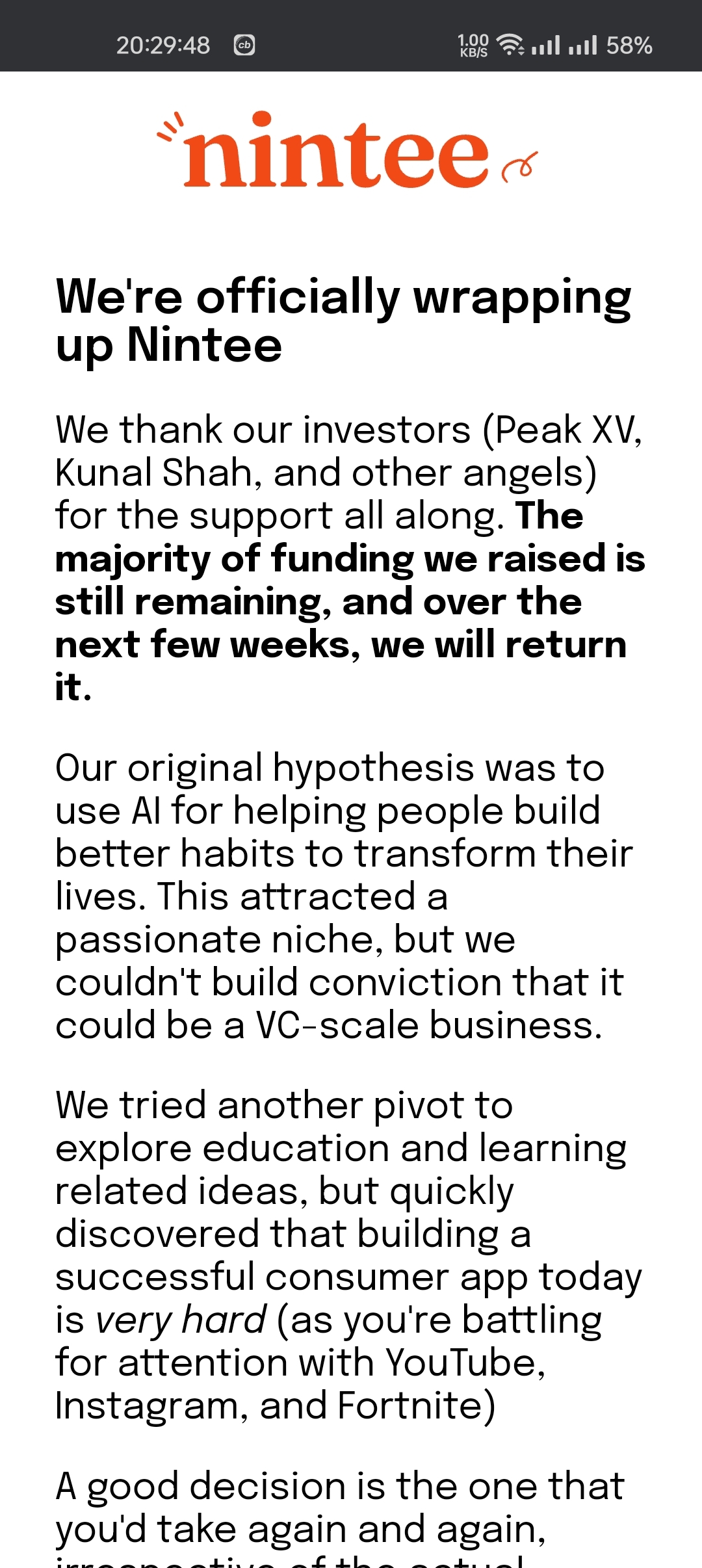 Nintee has officially declared its wrap up. Startup funded by people such as "Kunal Shah". Here are two reasons why a so called "AI" based startup didn't worked out. 1. Easy availability:- the problem which they were trying to solve was not even a problem, people can easily have that content from YouTube and believe me people in India still prefer a real person over an algorithm or "AI". 2. Market size:- There's not many health freaks in India who wants a healthy lifestyle and those who even want it they would prefer YouTube or just reading books. If you guys have some more reasons then please share in the comments. Now coming to the lesson/learning:- If your startup isn't working out just shut it down and switch to something else. Here, founder could have easily said that he will continue with this no matter what the market will tell, since he have big names as angel investors so he will just go on but he took the other way round. That's hard true entrepreneurship.