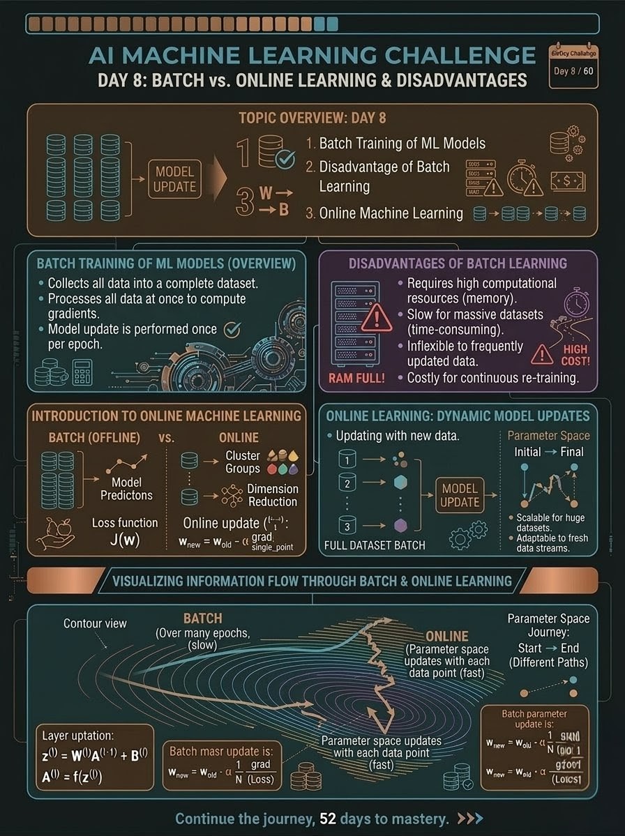 Day 8/60: Batch vs. Online Learning! Good morning everyone my name is Anuj Tongse and today is day 8/60 of AI machine learning challenge The AI Machine Learning Challenge continues! Today was a deep dive into how models digest data. 🧠 The Break