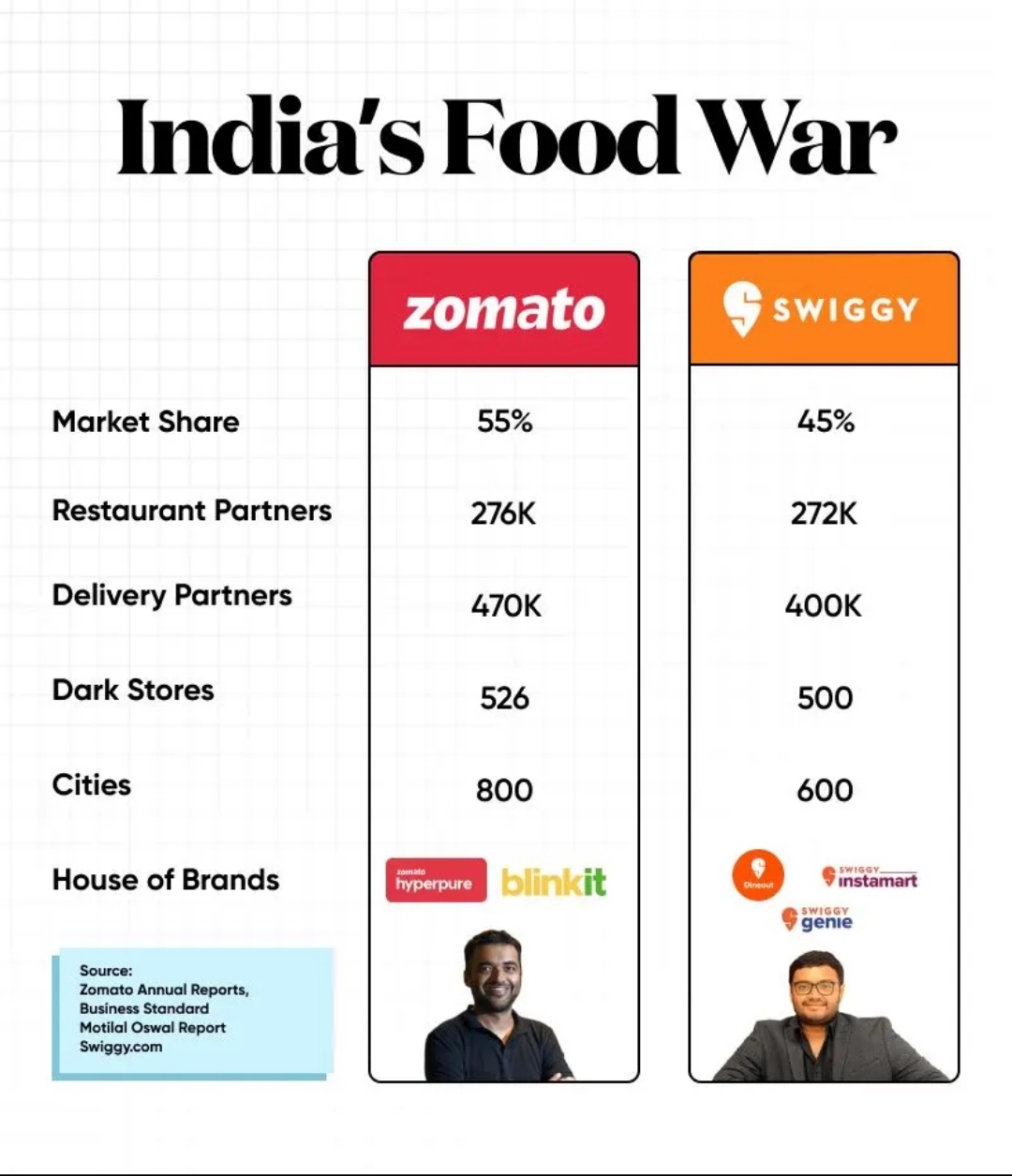 I thought that Swiggy was far behind than Zomato but in reality it is not as far as I thought. while scrolling YouTube I found this comparison table posted by GrowthX which shows the comparison between Swiggy and Zomato. What do you prefer Swiggy or