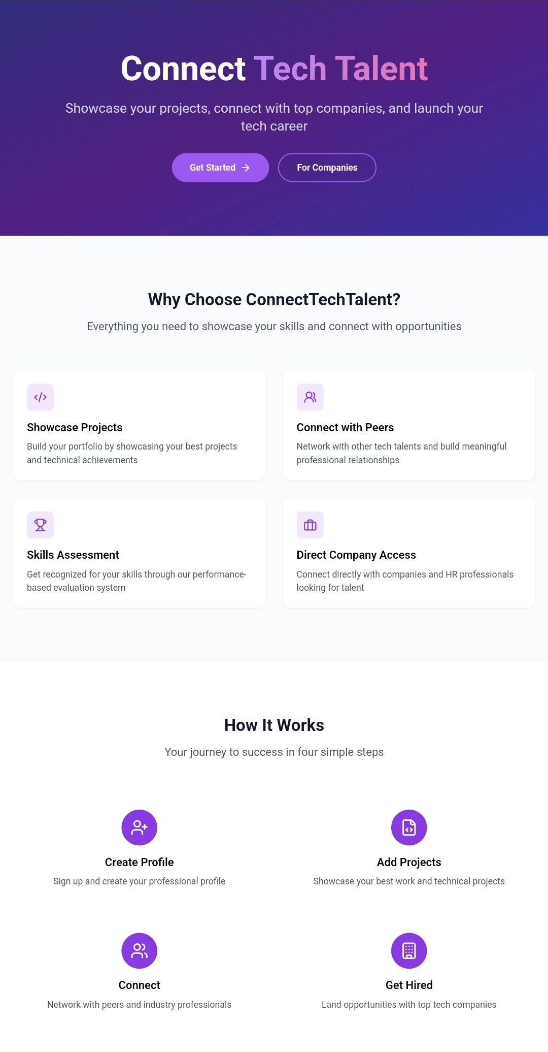 Happy to share the landing page of CONNECT-TECH-TALENT🚀 https://connect-tech-talent.netlify.app (in development) Visit this startup idea in Medial's December Showcase🚀 https://medial.app/idea/connect-tech-talent-0396bbab96742 Upvote and share yo