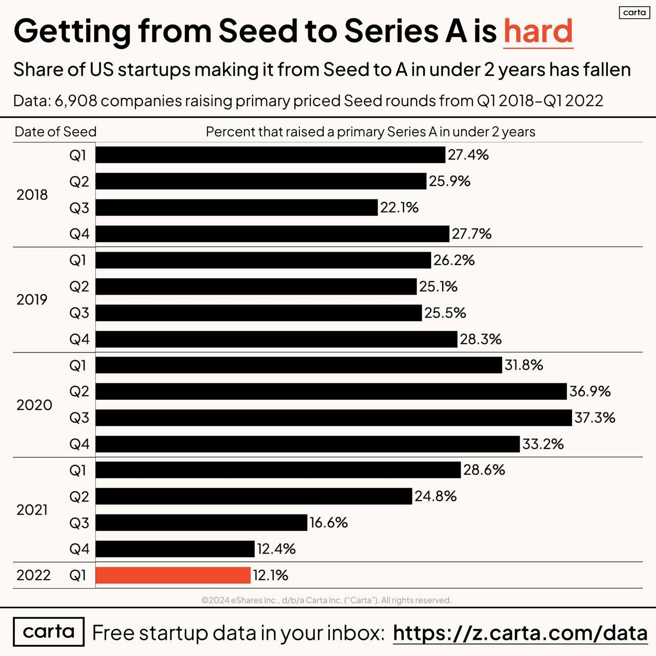 🔵 The Seed Funding Landscape of AI Startup in USA : Challenges and Opportunities Ahead Seed funding peaked in Q1 2022 but has slowed since then. Despite this, seed funding has weathered the downturn better than other stages. However, there’s a growing pipeline of seed-funded startups competing for Series A rounds. Additionally, the time between seed and Series A rounds has increased from 14 months in 2014 to 25 months in 2023. With more seed funds launching and larger funds, startups are staying longer at the seed stage. For startup founders, the road ahead is challenging, but the talent pool is expected to grow in 2024, potentially leading to increased company formation.