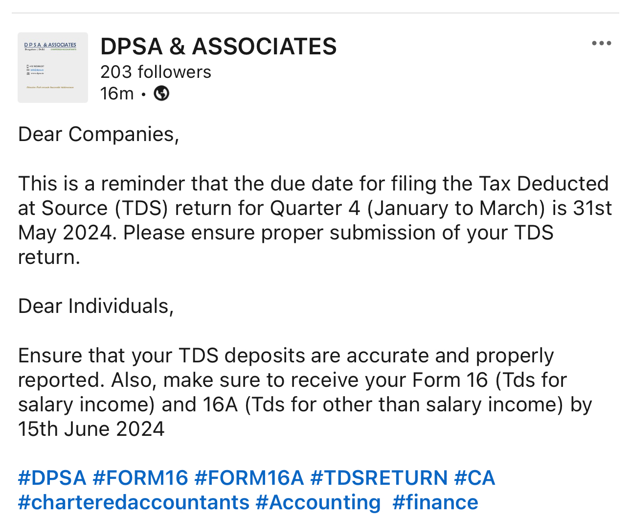 Dear Companies, This is a reminder that the due date for filing the Tax Deducted at Source (TDS) return for Quarter 4 (January to March) is 31st May 2024. Please ensure proper submission of your TDS return. Dear Individuals, Ensure that your TDS d