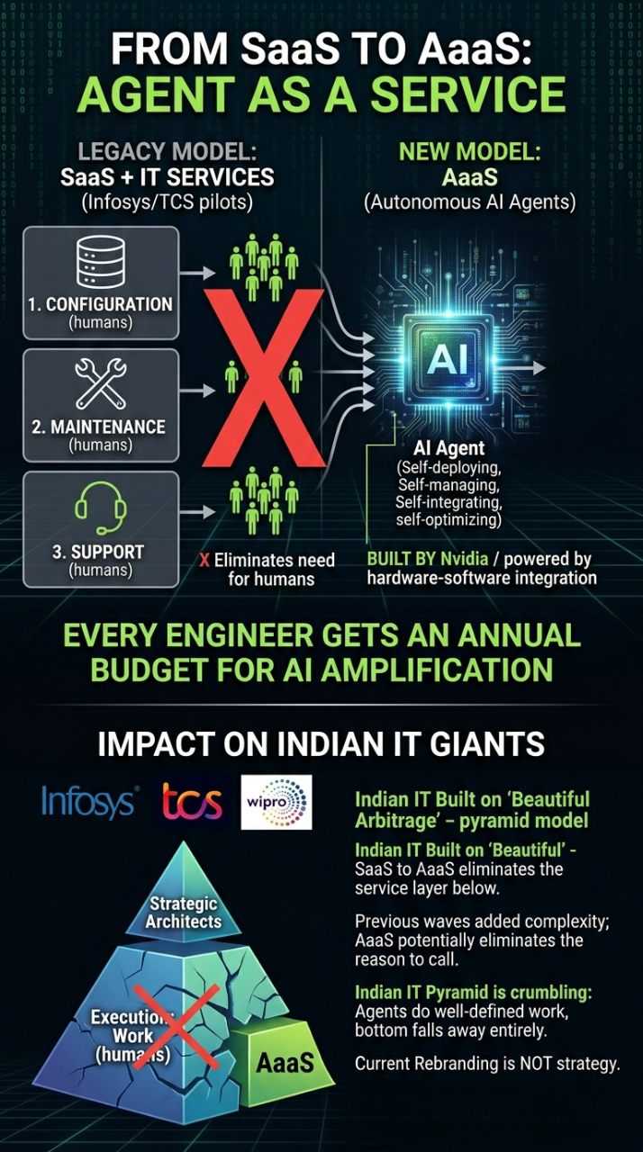 Is the $250B Indian IT party over? Jensen Huang’s GTC 2026 keynote just dropped a bombshell: SaaS is becoming AaaS (Agent as a Service). Here is why TCS, Infosys, and Wipro should be worried: The "Pilot" Problem: Indian IT was built on selling "pi