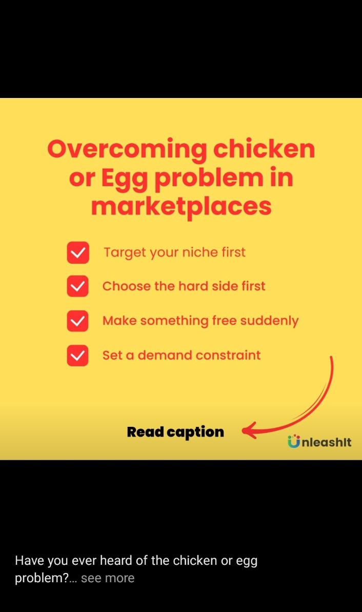 Here are my 4 lessons to avoid chicken or egg problem in marketplaces. ( Implementing in UnleashIT) 1. Target your niche first: Find the small groups in your community that care most about your marketplace. Ex: Uber started with “rich bros” gettin