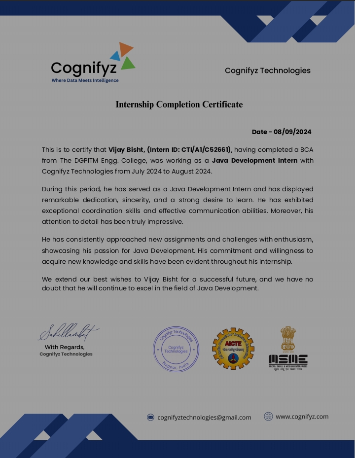 Iโm thrilled to share that Iโve successfully completed my internship at Cognifyz Technology! This experience provided me with invaluable hands-on learning and helped me enhance my technical and professional skills. A huge thank you to Cognifyz for gi