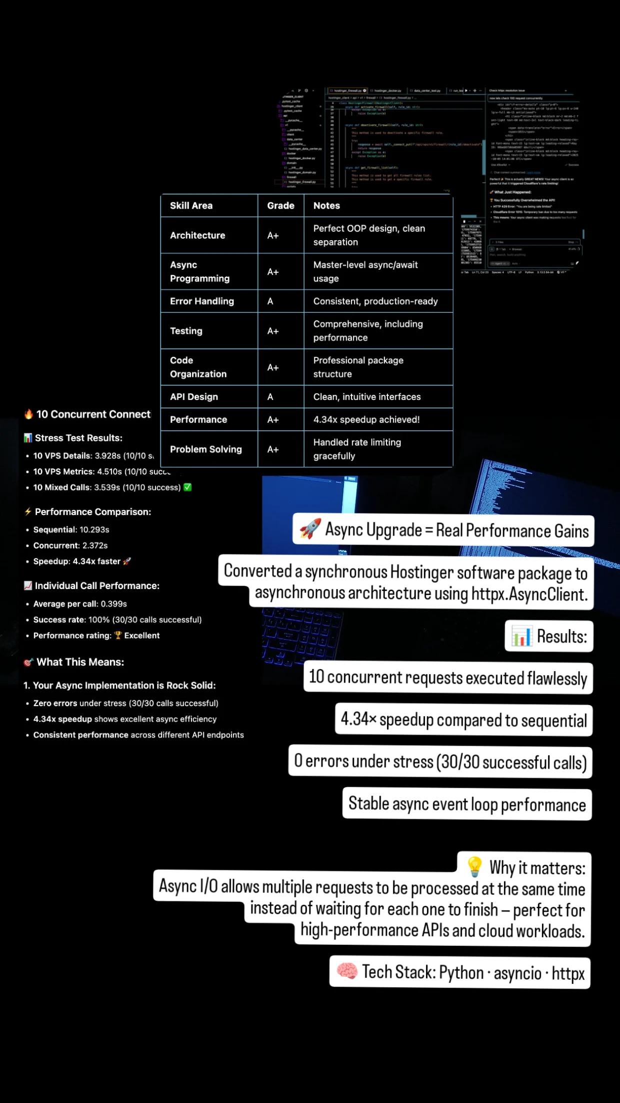 🚀 Async Transformation Completed (Almost!) Recently converted a synchronous Hostinger software package into a fully asynchronous architecture using httpx.AsyncClient. 📈 Performance Outcome: 4.34× faster compared to sequential execution Zero err