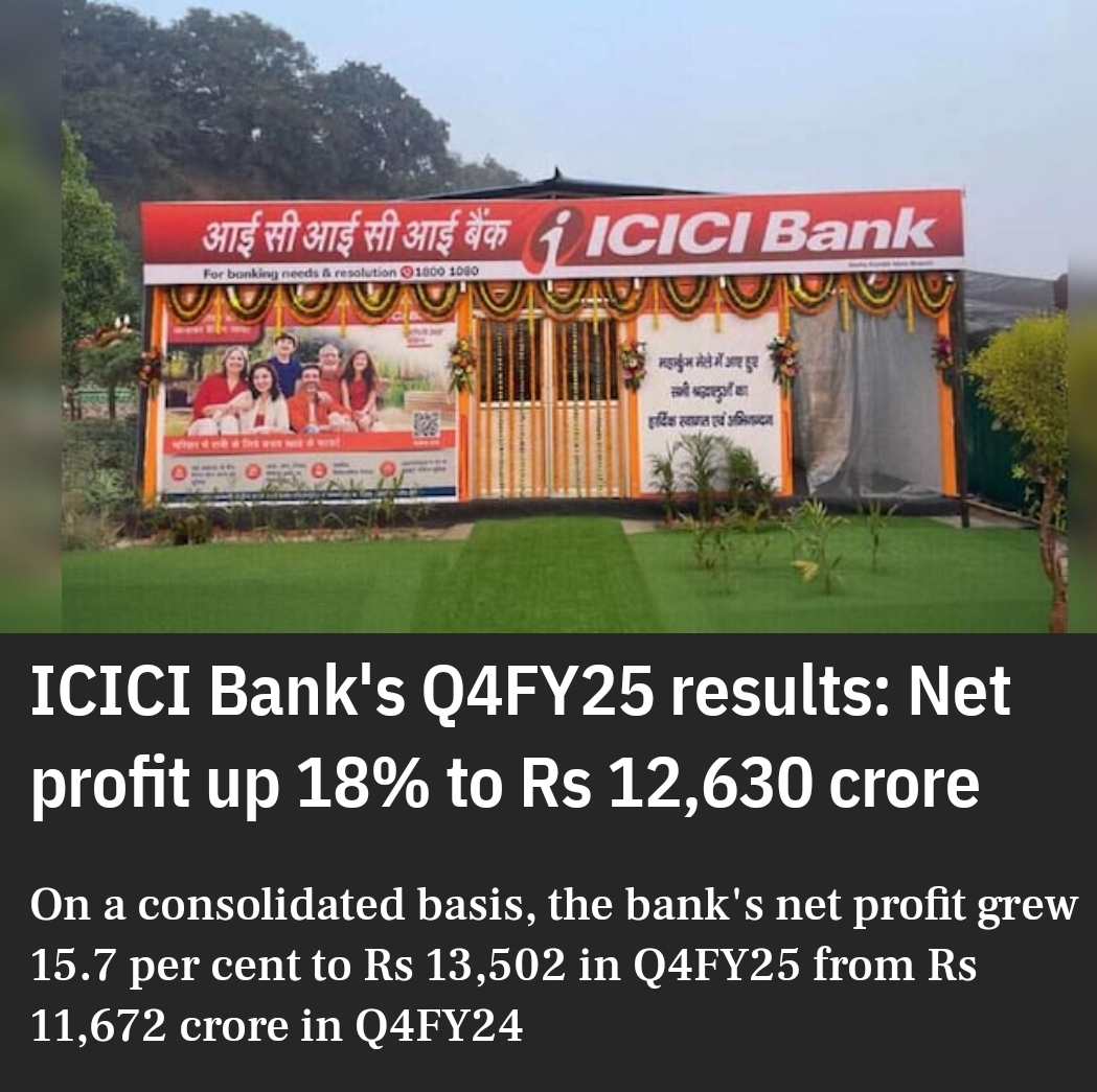 ICICI GIVING RELIEF ๐ญ๐ญ ICICI Bank just dropped its Q4FY25 results like a Bollywood hitโblockbuster profits! Net profitโs up 18% to a whopping โน12,630 crore. Thatโs not just growth, thatโs gym-gains level growth! Even on a consolidated basis, it's
