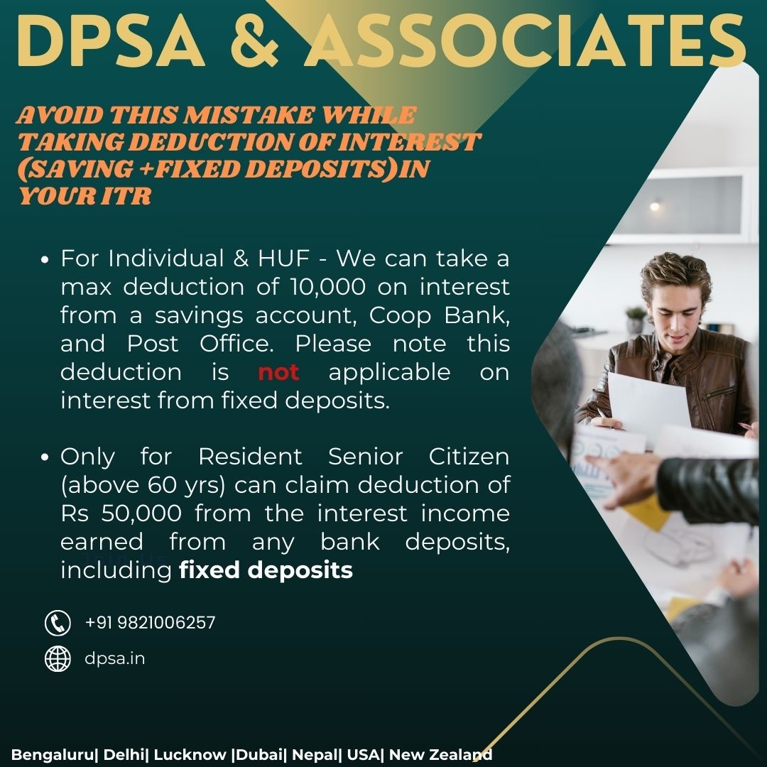 AVOID this mistake WHILE taking deduction of interest (saving +fixed deposit)in your ITR🔴🔴🔴🔴🔴 Since ITR Season is around, highlighting common confusion ➡️For Individual & HUF - We can take a max deduction of 10,000 on interest from a savings a