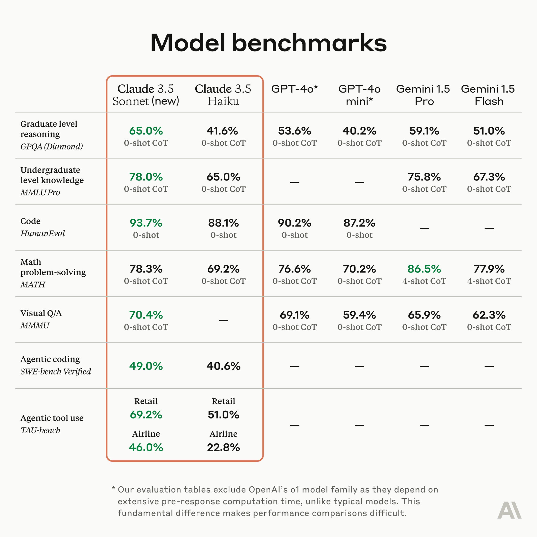 AI Model Performance Benchmarks: ๐ Comparing Claude, GPT-4o, and Gemini Across Key Tasks with Claude 3.5 Sonnet performing best overall, especially in code (93.7%) and reasoning (65.0%). Gemini 1.5 Pro excels in math (86.5% with 4-shot CoT). GPT-