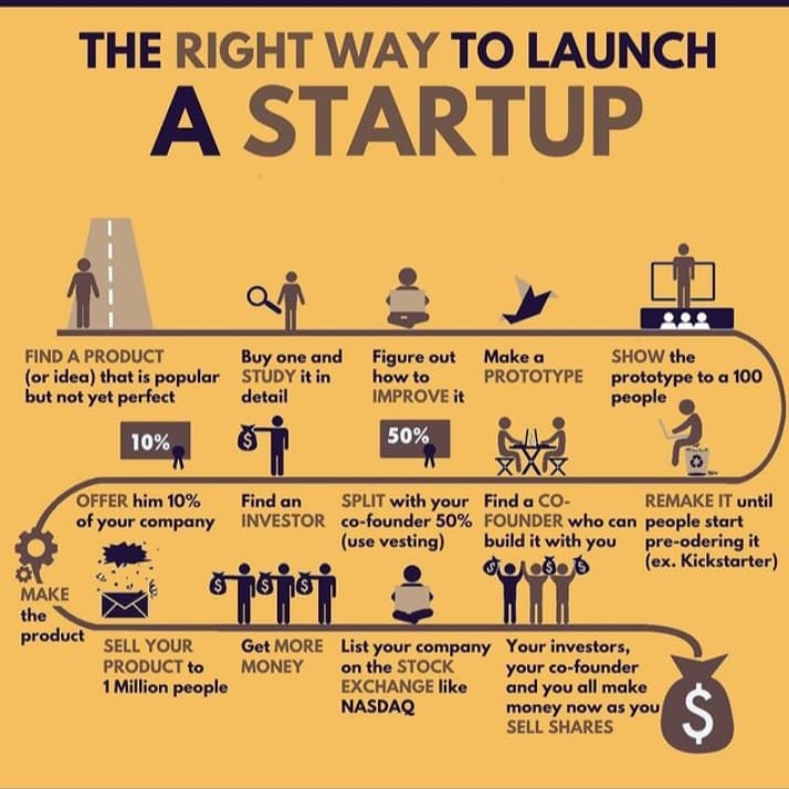 Right way for launching a startup 🚀✨️ • Find a popular product (or idea) that is not yet perfect. market is saturated but innovation play an important role here. • Study it in detail. • Make a prototype. • Show the prototype to 100 people. • Ge