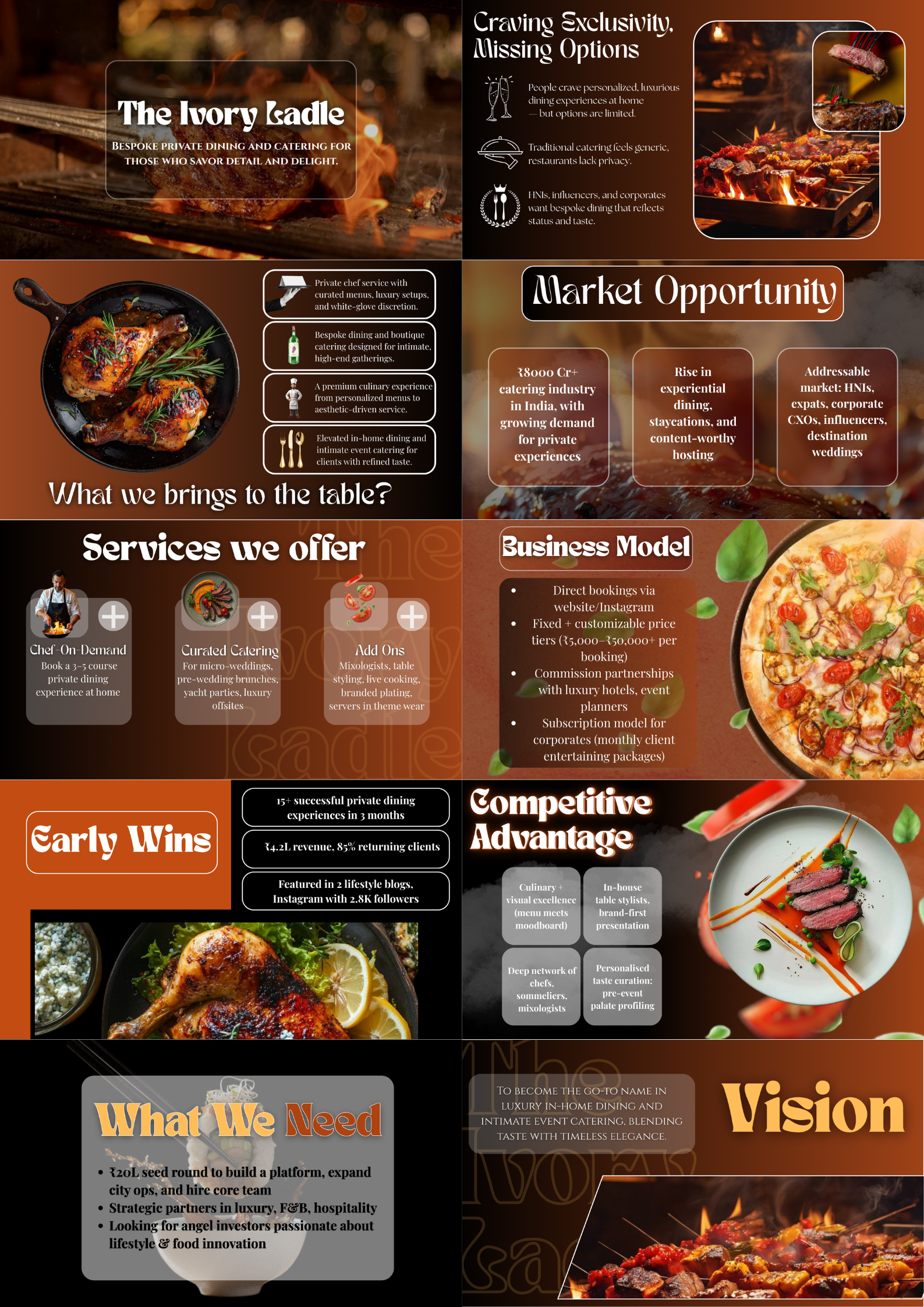 just finished a concept pitch deck for the ivory ladle โ a private dining and micro-catering studio designed for intimate, high-end experiences at home this one was all about balancing elegance with clarity: premium visuals, clean storytelling, and a