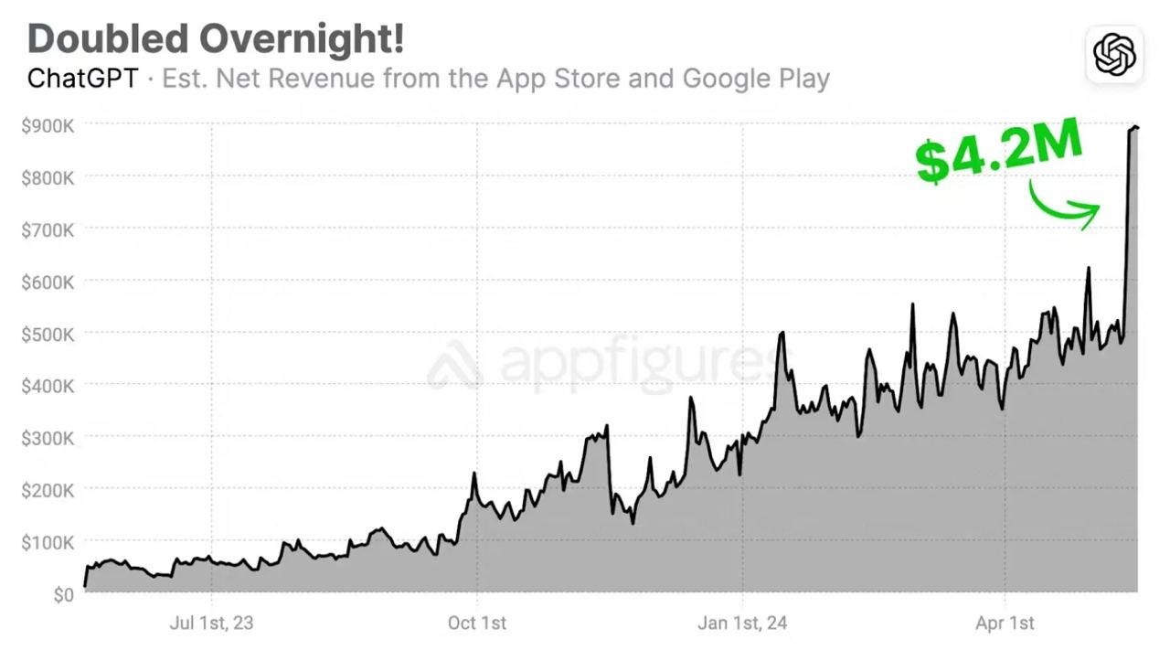 โผ๏ธChatGPT Mobile Revenue Soars with GPT-4o The launch of OpenAIโs GPT-4o has nearly doubled ChatGPTโs mobile app revenue. On May 16, net revenue hit $900,000, up from a daily average of $491,000, driven by users upgrading to the $19.99 Plus subscrip