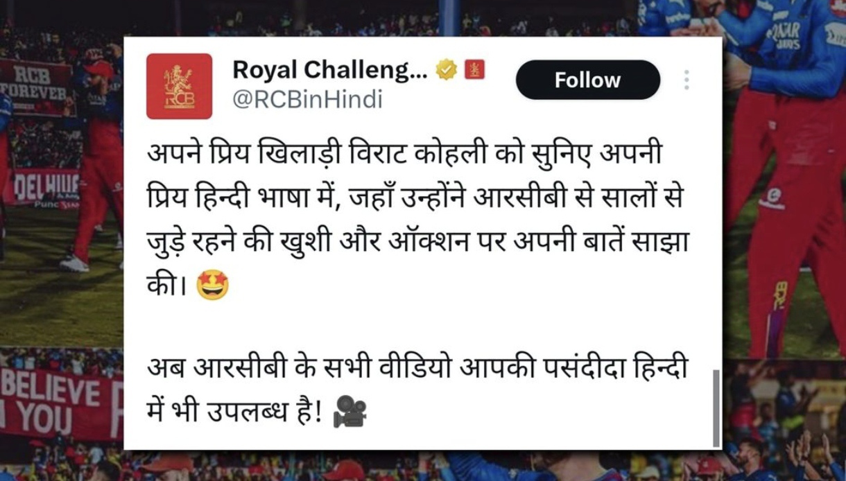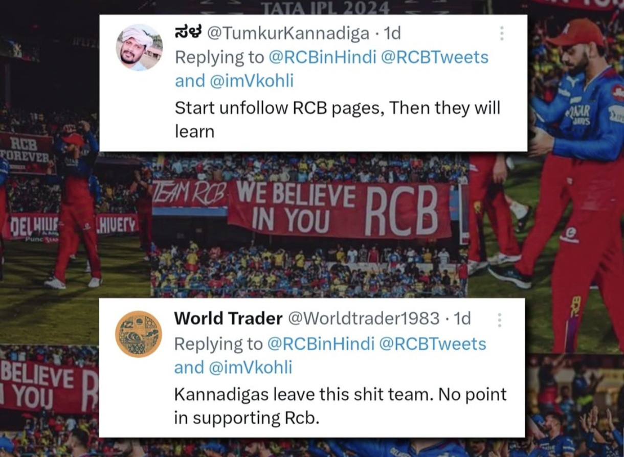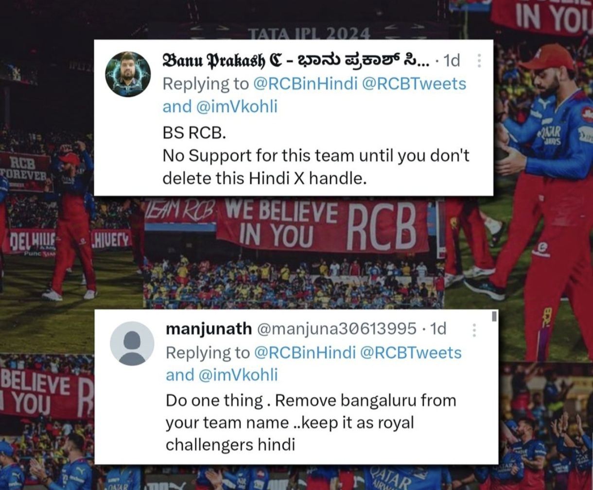 🚨 The Royal Challengers Bangalore (RCB) is facing backlash from its local fans for posting updates in Hindi on their new social media vertical aimed at Hindi-speaking fans. Fans are questioning why RCB is using Hindi when teams like Delhi Capitals o