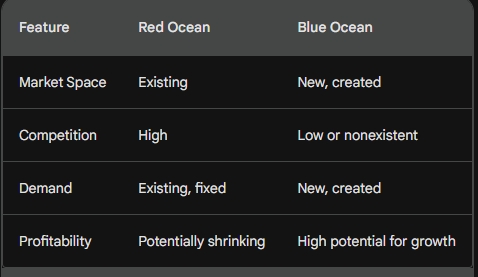 ⭐ Blue Ocean Strategy: Find Your Own Peaceful Pond! Imagine the business world. Most companies are in a 'Red Ocean': it's like a crowded pond, full of fish (competitors) fighting over the same food (customers). Everyone's battling, making the water