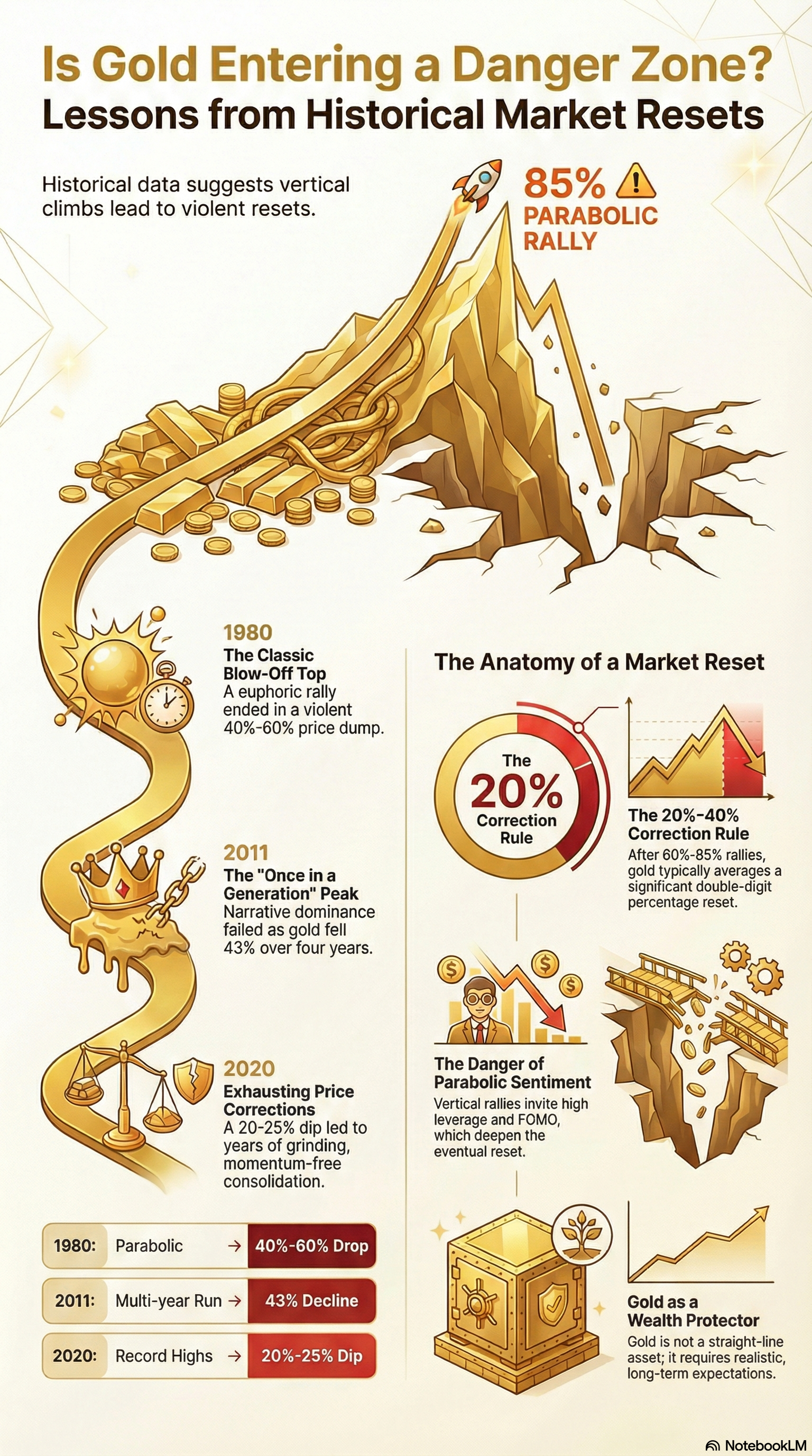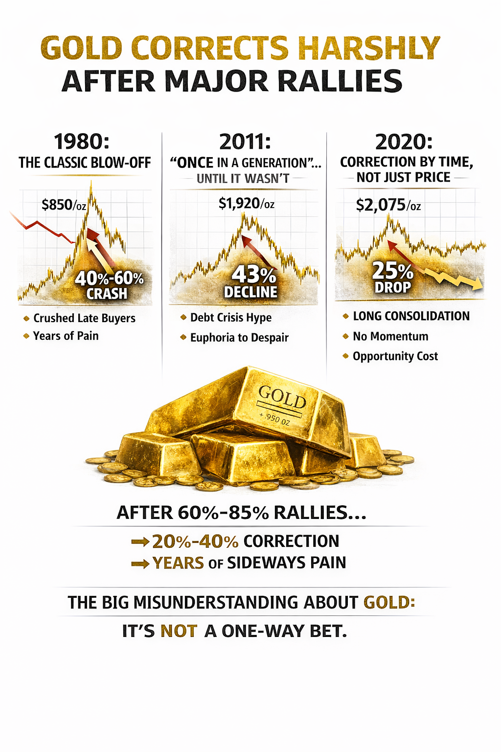 Gold has always played an important role as a long-term store of value. But history shows that after strong, fast rallies, the market often goes through a period of correction or consolidation. This visual looks at past major gold cycles — 1980, 201