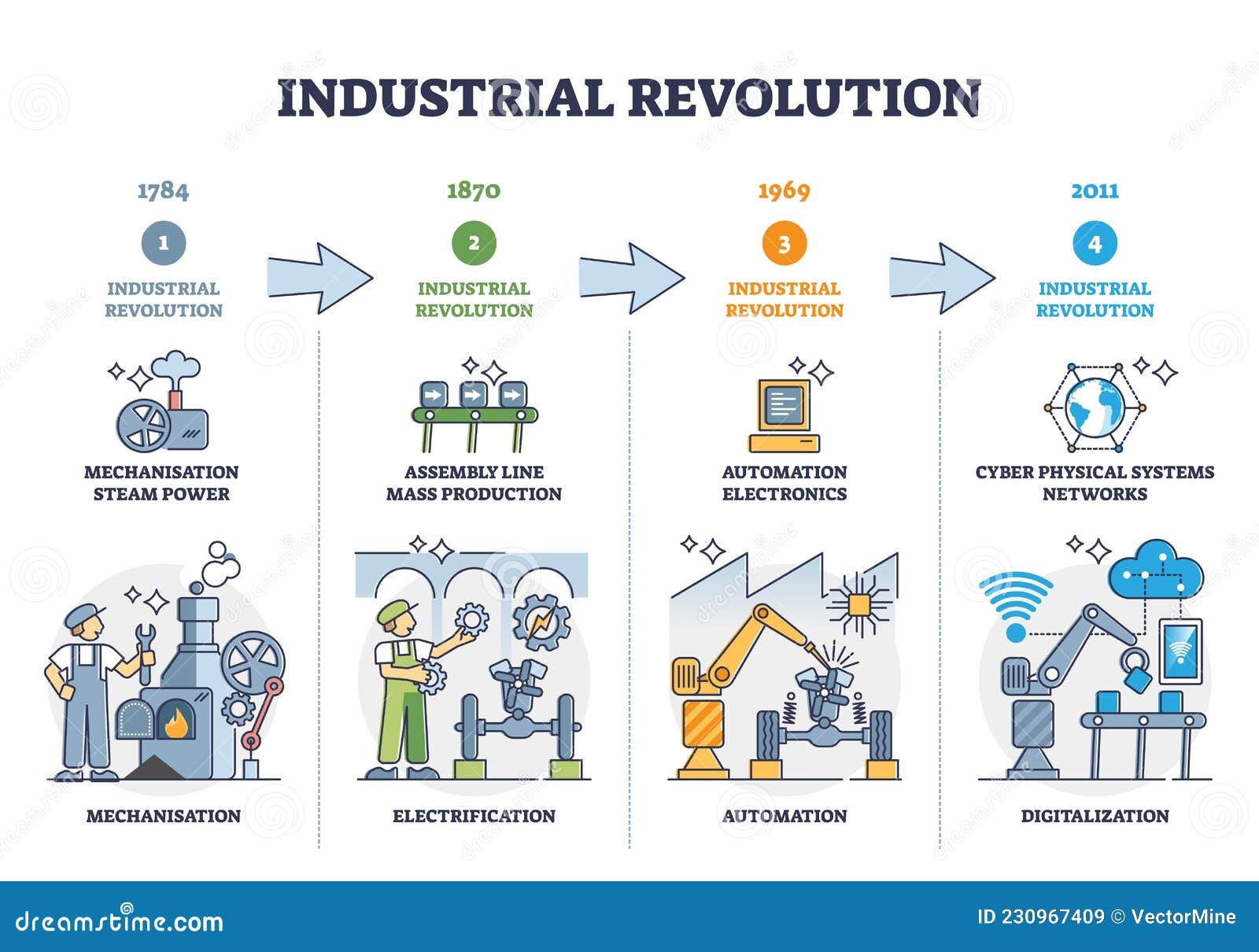 Business Revolution in Market and the Industrial Revolution. It highlights four distinct phases: the 1st Industrial Revolution in 1784 with mechanization and steam power, the 2nd in 1870 with electrification and mass production, the 3rd in 1969 with automation and electronics, and the ongoing 4th with cyber-physical systems. This visual representation captures the evolution from mechanical to digital technologies in industry.