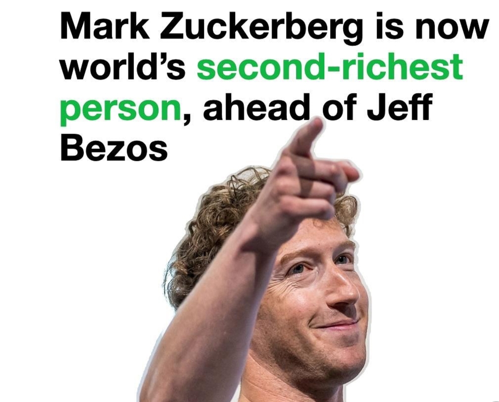 Meta CEO Mark Zuckerberg has surpassed Jeff Bezos as the world's second-richest person. With his 13% stake in Meta, Mark's net worth has risen by $78 billion in 2024, more than any other member of the 500 richest people tracked by the index. Source: