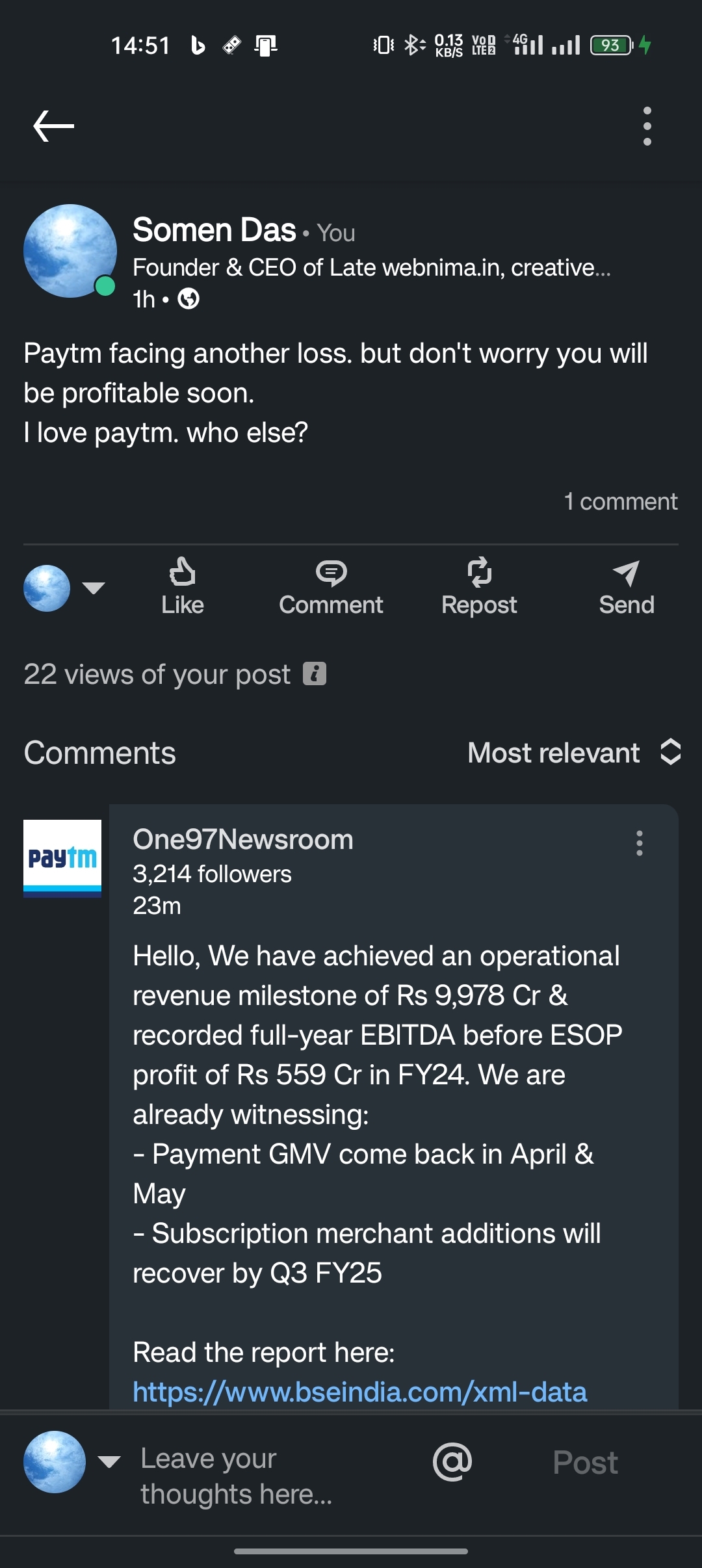 Paytm Replied Hello, We have achieved an operational revenue milestone of Rs 9,978 Cr & recorded full-year EBITDA before ESOP profit of Rs 559 Cr in FY24. We are already witnessing: Payment GMV come back in April & May Subscription merchant additi